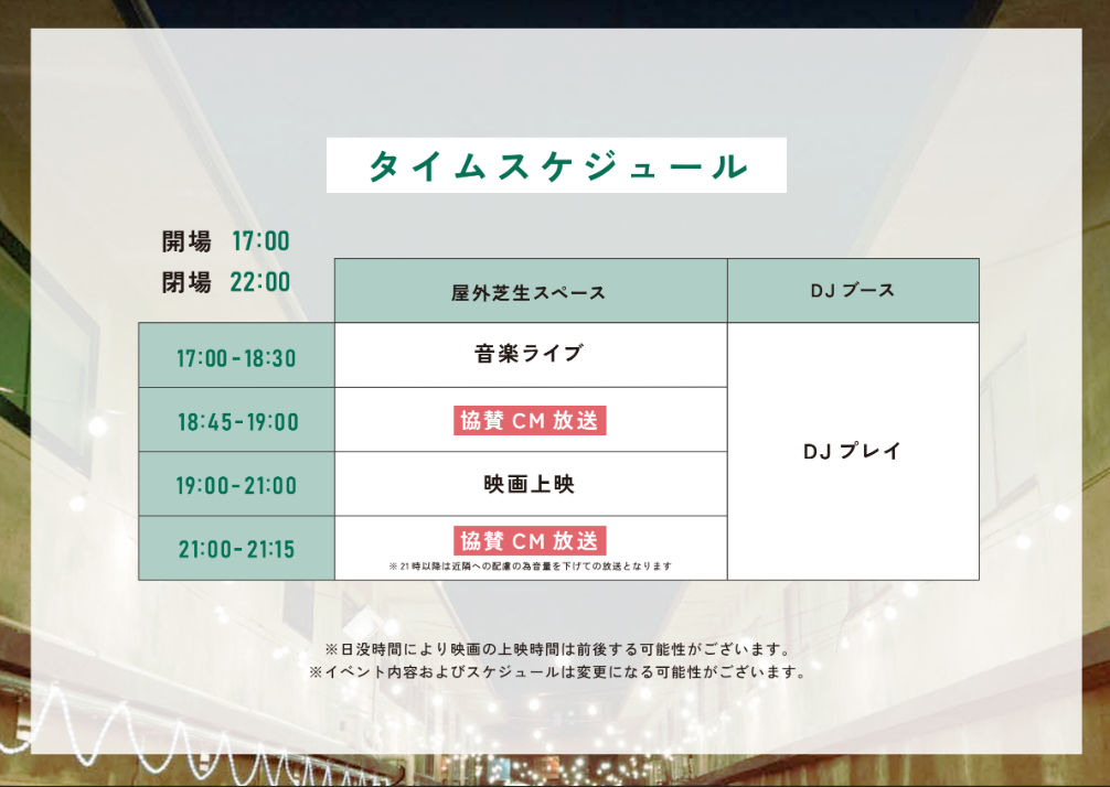 内容:屋外映画上映、DJ・ライブ演奏、フード&ドリンク