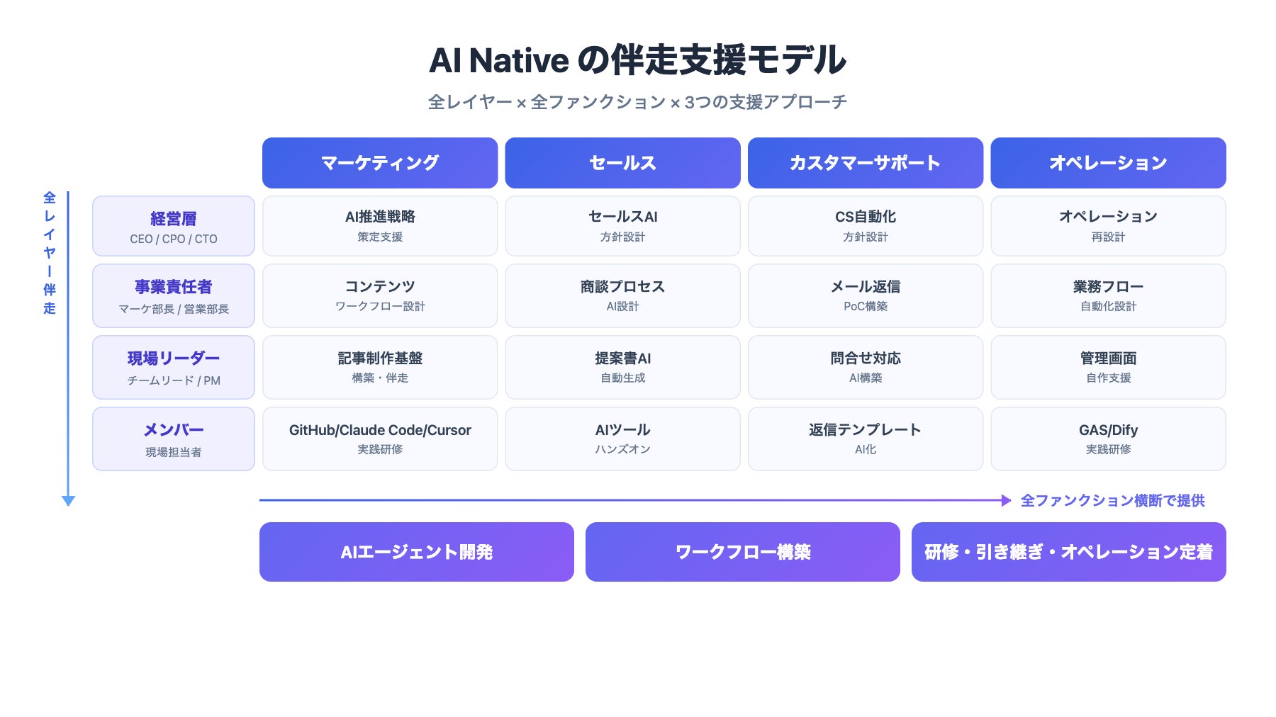 経営層・事業責任者・現場リーダー・メンバーの全レイヤーに同時に伴走し、自社AIプロダクトの提供に留まらず、現場チームが自ら課題を発見し仕組みを構築できる自律的なAIネイティブ組織への変革を支援します。