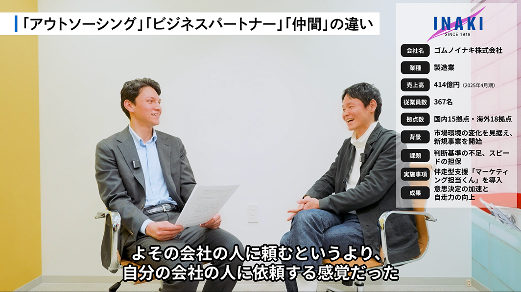 マーケティングの伴走支援サービス「マーケティング担当くん®」を提供する株式会社オルタック(本社:東京都中央区、代表取締役:イルマス玲、以下「オルタック」)は、自動車部品を中心とした工業用ゴム部品のOEM生産を手がける創業106年の企業、ゴムノイナキ株式会社(本社:愛知県名古屋市、代表取締役:稲木裕、以下「ゴムノイナキ」)への新規事業支援の事例を、インタビュー動画および記事として公開いたしました。
