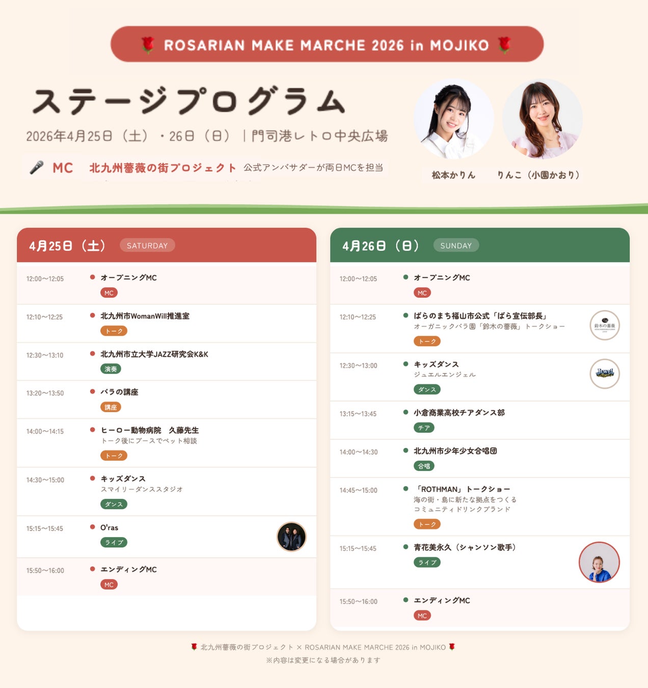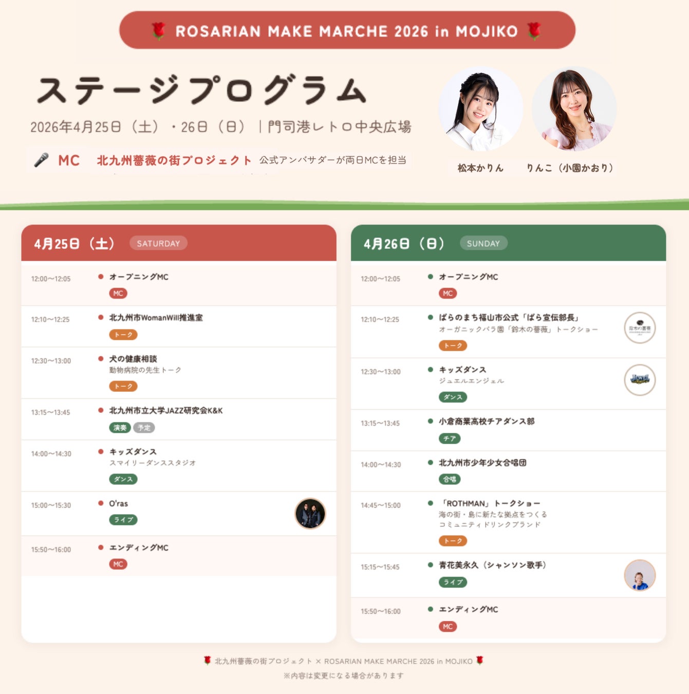 ジャズ演奏、キッズダンス、チア、合唱、アーティストライブを予定。 MCは北九州薔薇の街プロジェクトアンバサダーの松本かりん|りんこ(小園かおり)が担当。