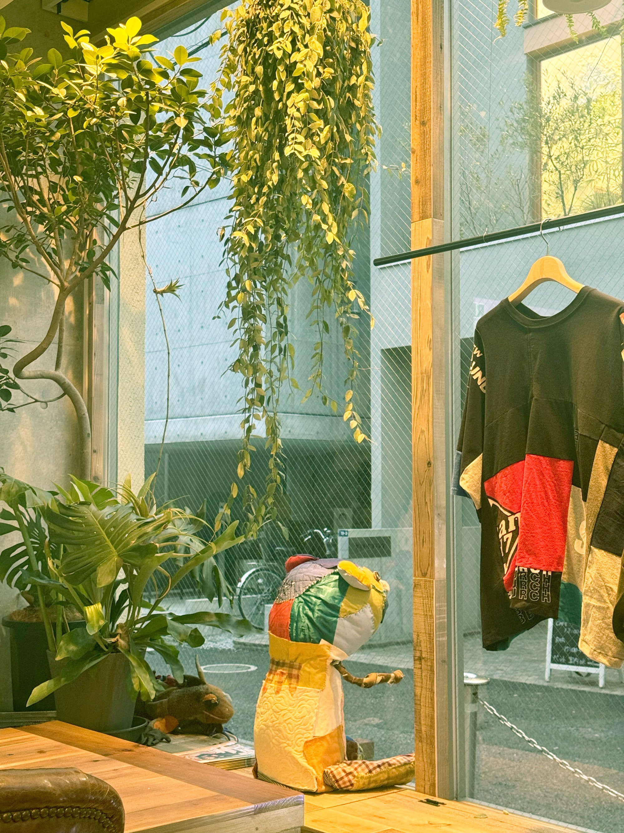 NEAR Harajukuは、商店街から細道に入ると見えてくる、植物が彩る大きなガラス窓の店舗。晴れた日は、お店の入り口にパッチワークのくまのぬいぐるみがお客様を出迎えています。古材を組み合わせて作られた床は、歩くとキシキシと音を立て、そっと記憶を呼び起こします。