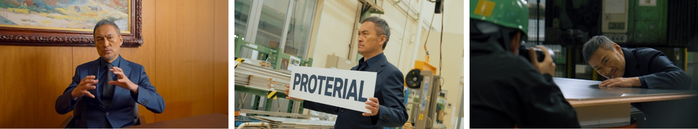 映像内では「プロ・マテリアル…プロテリアル」と、マテリアルのプロとして革新的な素材を作ってきた当社のアイデンティティを紐解き、最後は「名前だけでも覚えてください!」と力強く宣言します。社名を繰り返し、熱弁を振るう渡辺謙さんの圧巻の演技は必見です。