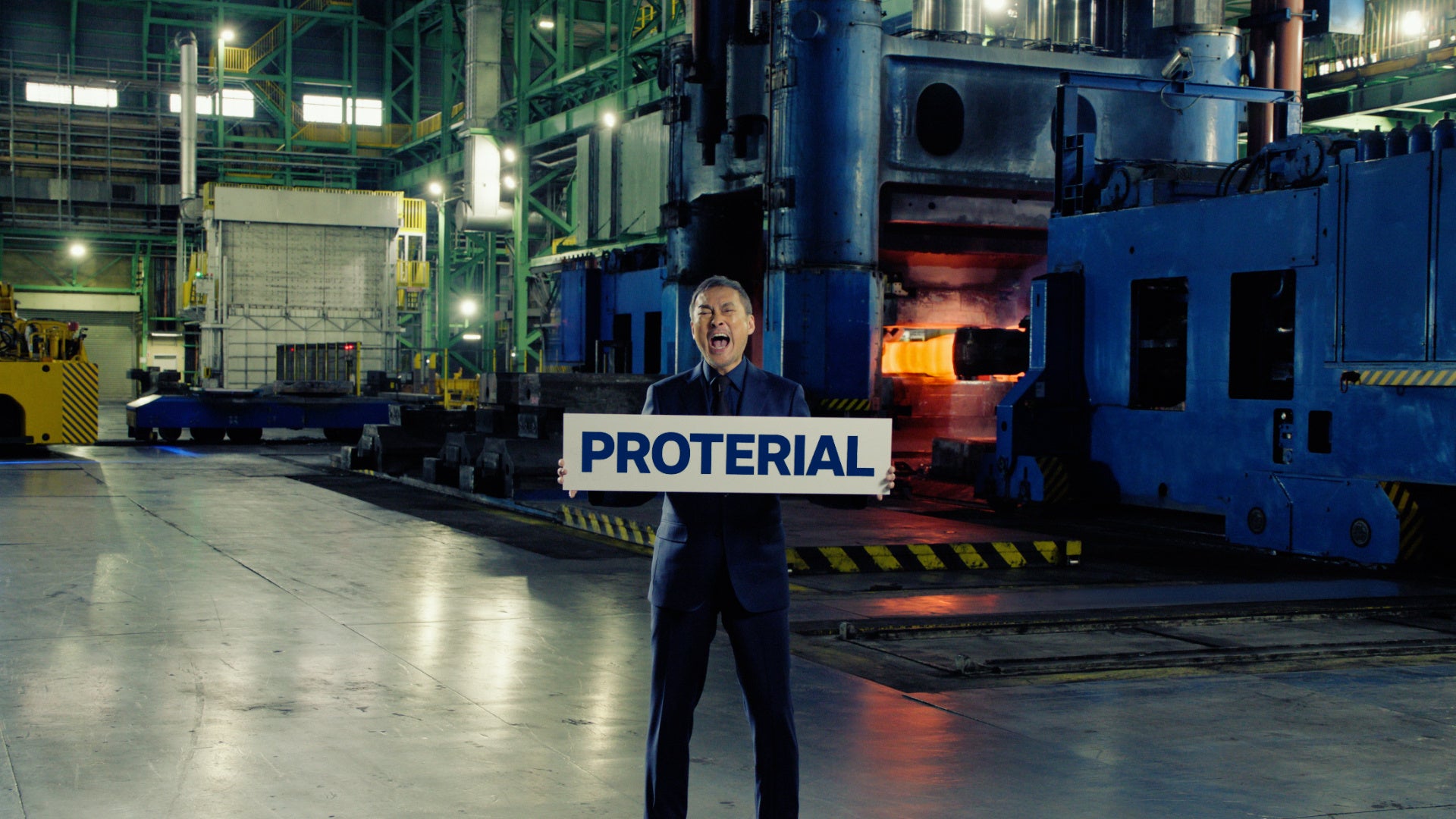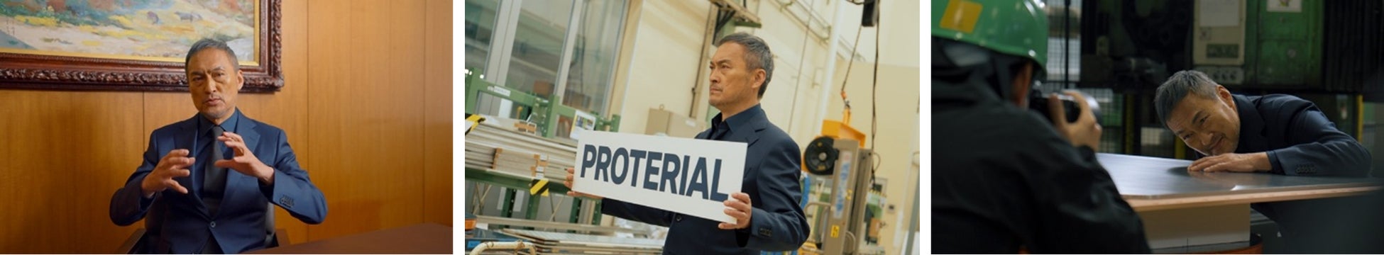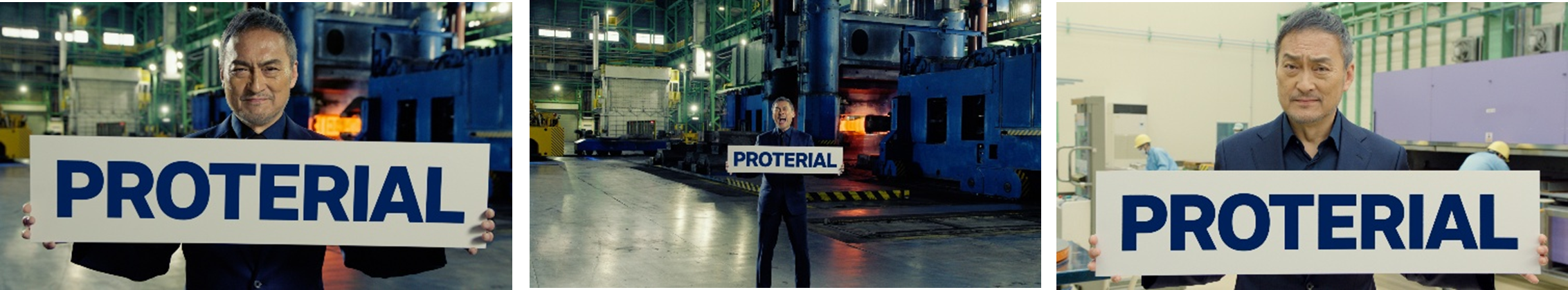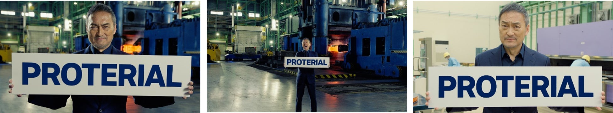 今回の新CMでは、渡辺謙さんが当社が誇る大迫力の生産現場に登場します。真っ赤に熱された金属塊が鍛造されるダイナミックな環境の中で、あるいは、最先端の技術が光る精密な開発の現場で、プロテリアルの社名が書かれたボードを手に、稼働音に負けじと真っ直ぐに語りかけます。社名を何度も繰り返す演出には、「プロテリアルを知ってもらいたい」というメッセージが込められており、渡辺謙さんの圧倒的な熱量と説得力のある演技によって、プロテリアルの揺るぎない決意を体現する内容となっています。