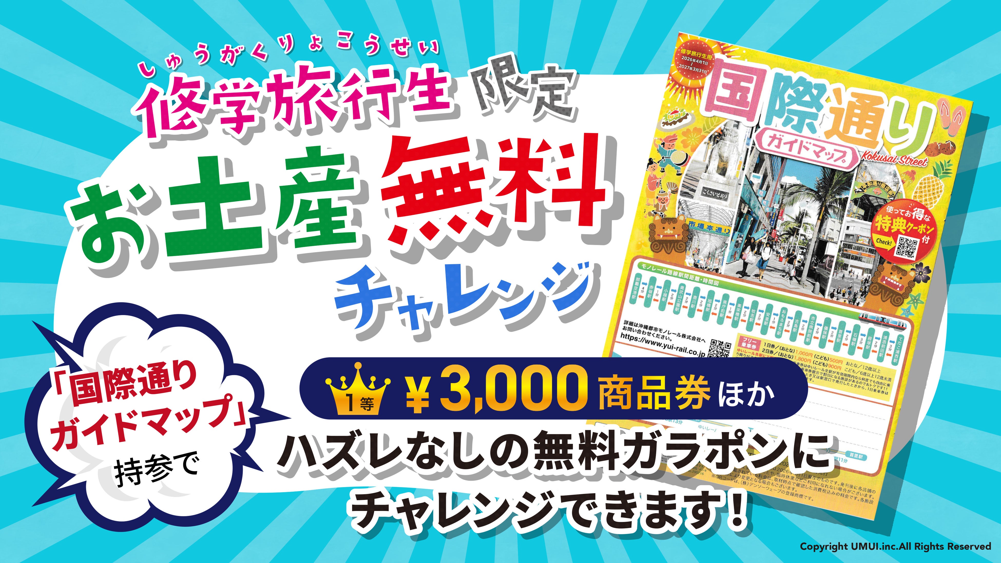 沖縄県那覇市の国際通りから公設市場に続く“市場本通り”にて沖縄土産店を運営する株式会社UMUI(本社 沖縄県那覇市松尾2丁目8-28)は、2026年4月1日より、修学旅行生を対象とした特別イベント「お楽しみガラポン抽選会」を開催致します。本企画は平均5,000円~10,000円と言われる限られたお小遣いのやりくりをする学生を応援し、沖縄での思い出作りをサポートすることを目的とした取組となります。