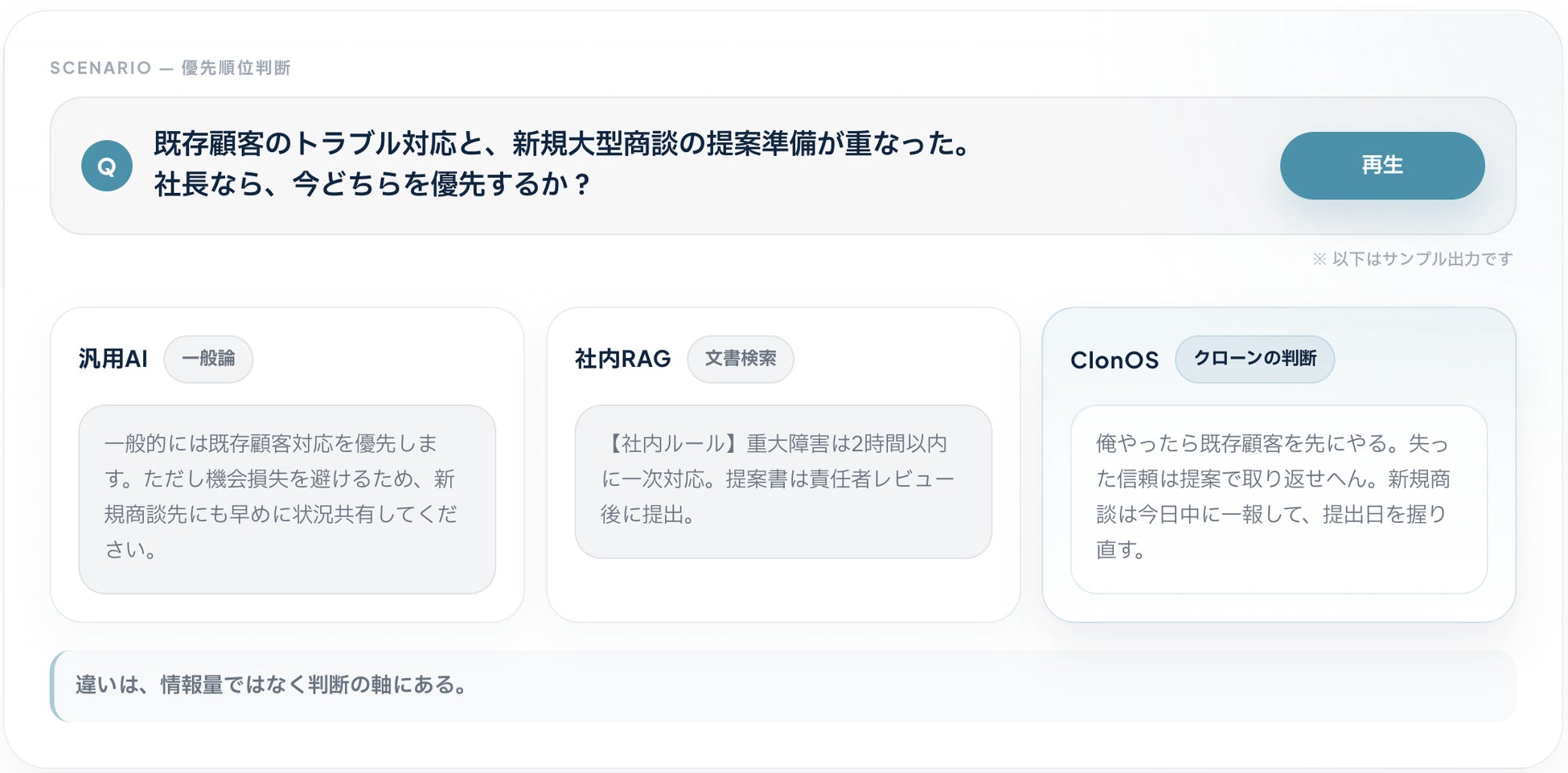 ・理念に基づいた行動変容:組織の理念を全社員のクローンに反映させることで、全社一丸となった「理念経営」を現場レベルで体現させます 。