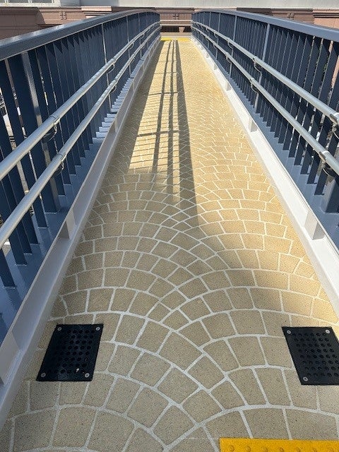 本工事は、株式会社MATの認定施工店である株式会社末廣が施工を担当し、高品質かつ短期間での施工を実現しました。老朽化が進んでいた歩道橋の床面は、専門技術を有する施工により美しく再生され、利用者からは「見違えるほどきれいになった」と高い評価を得ています。