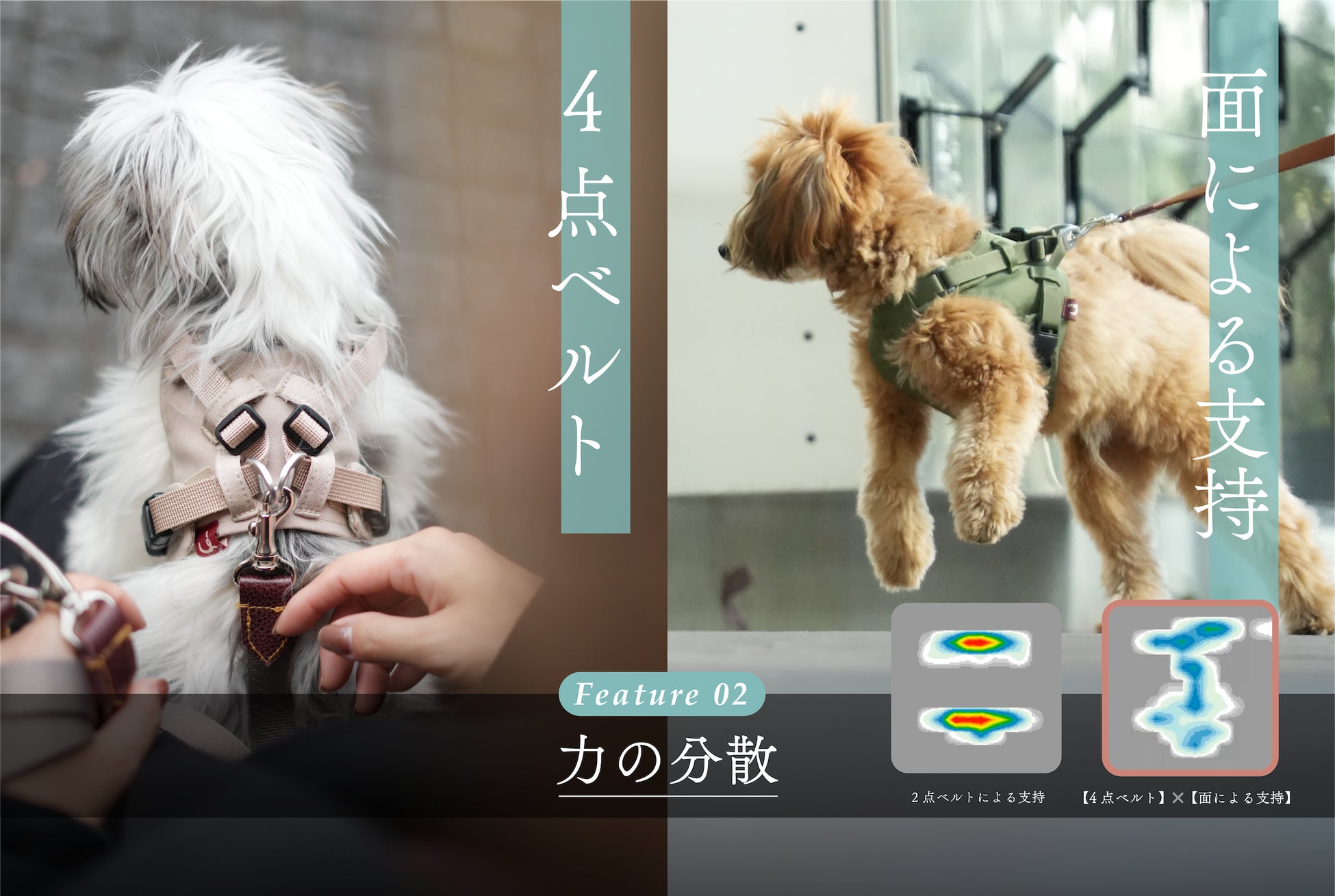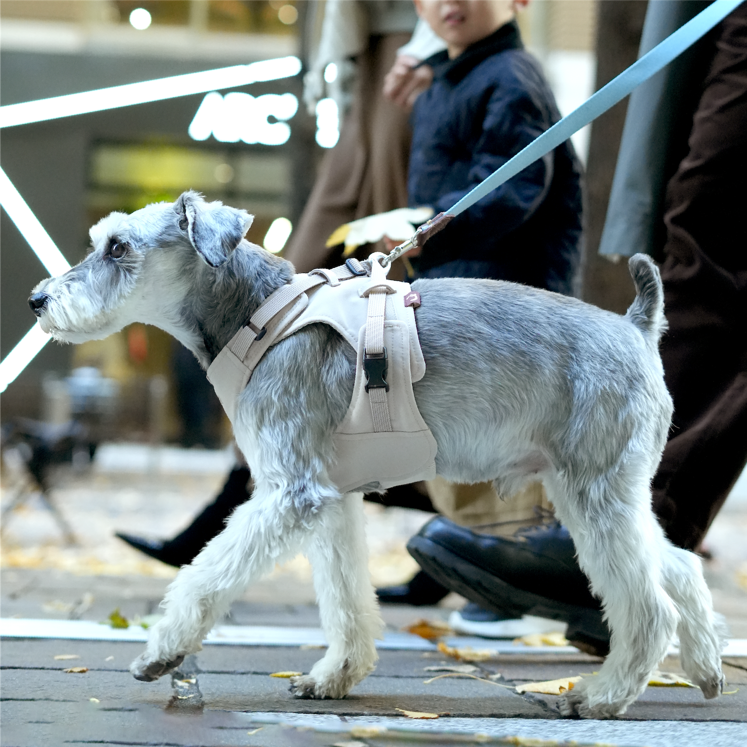 足を持たれるのが嫌い、じっとしているのが苦手、シニアで足が上げにくいーーー。そんな様々な個性を持つ子達にも装着しやすいように考えたハーネスです。「お散歩に連れていってあげたいのに、連れて行くまでが大変」。そんな飼い主さまの優しさと苦労に寄り添う設計です。