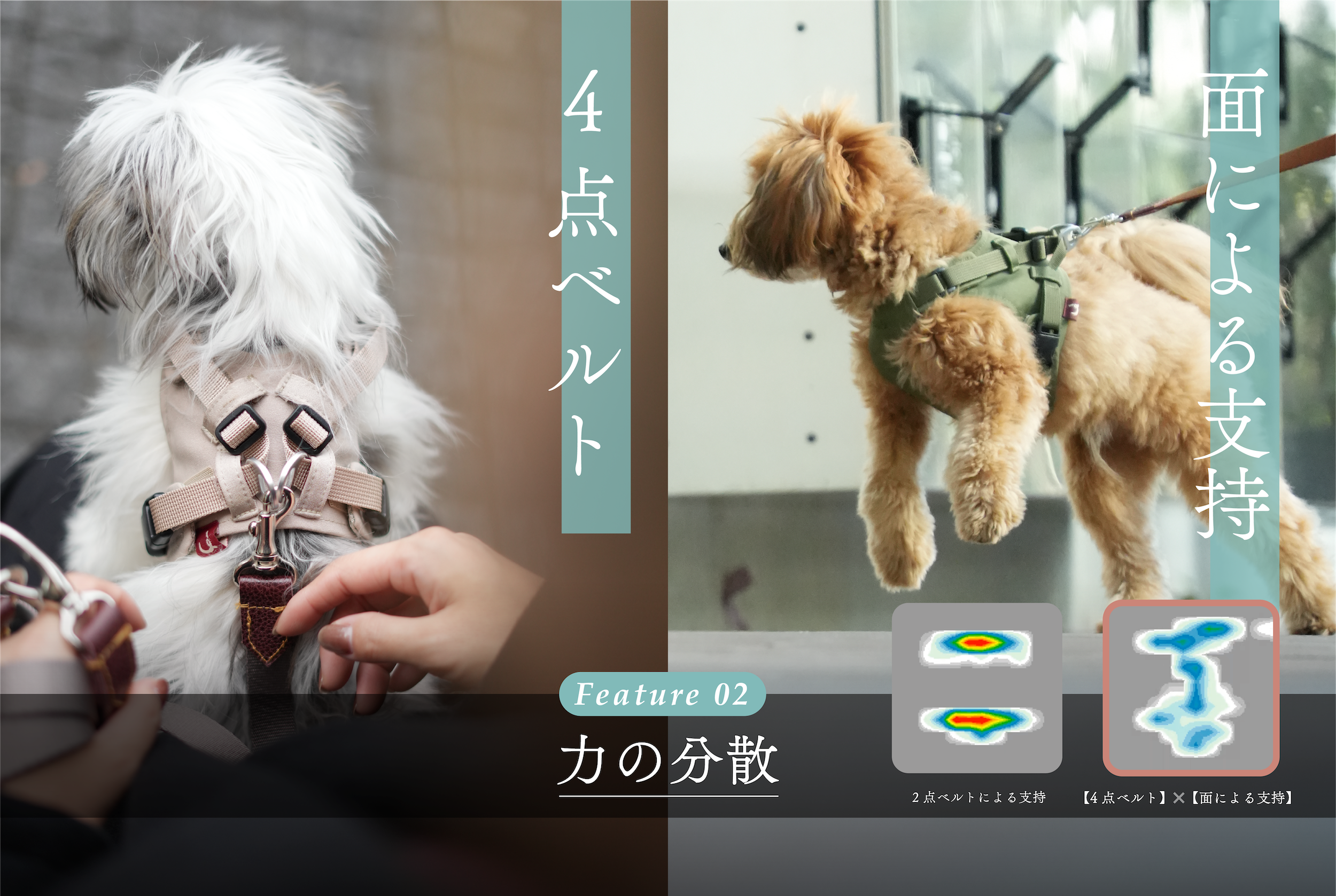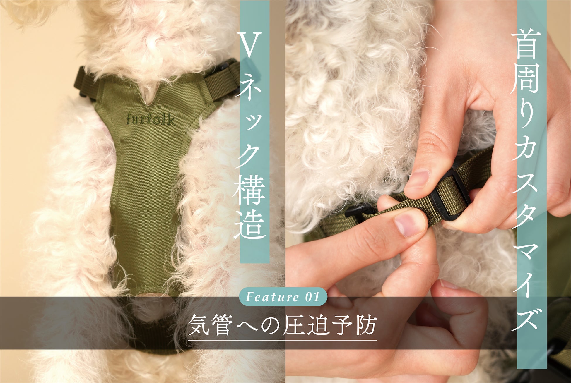 引っぱりで咳が出やすい子や、首の負荷に弱い子を想定して開発。特に小型犬は遺伝的に気管が弱い子が多いため、生涯、少しでも長くお散歩を楽しめるようにという想いを設計に込めました。