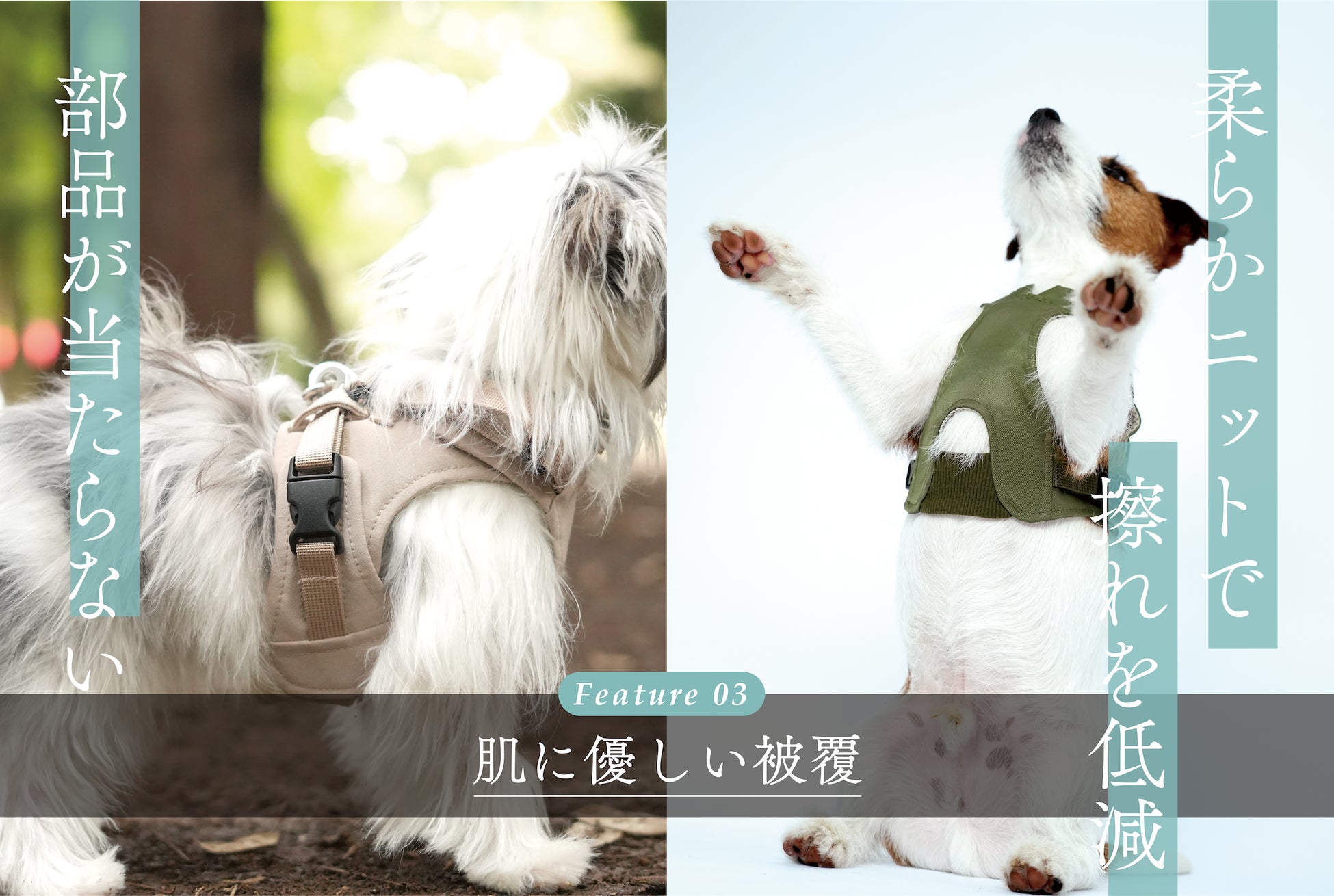 硬い部品が皮膚や被毛に当たらないようにすることで、皮膚の擦れや断毛を低減。引っ張らないといけない時に、部品が身体に食い込まない優しい設計です。また、腹部は柔らかいニット素材を採用することで、薄い皮膚の擦れを低減します。