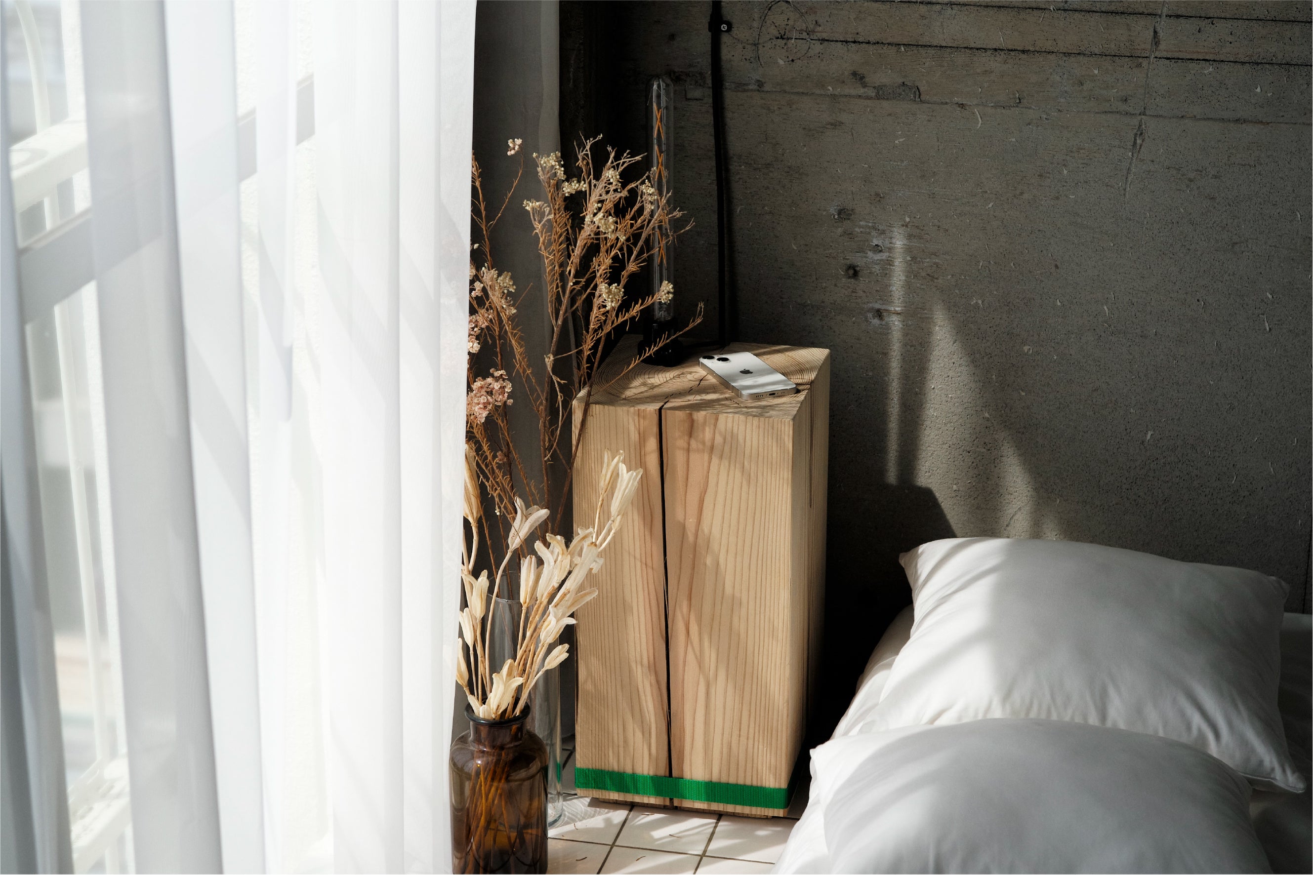 BEACON(ビーコン)は、夜の海を照らし、進むべき道を指し示す灯台のこと。樹齢80年の丸太から削り出されたこの小さなサイドテーブルは、ベッドサイドにそっと光を灯します。大径木の割れ防止のために設けられる「背割」は、電気配線用の溝とすることで、ベッドサイドの照明や充電中のスマホ置き場として利用することができます。
