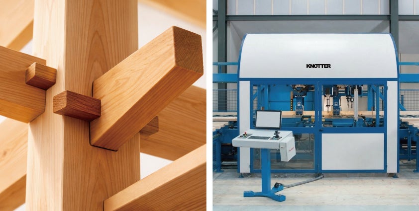 ① 伝統×現代 : 釘や接着剤に頼らない伝統構法とプレカット生産技術を融合。工具不要で何度でも解体・組立が可能