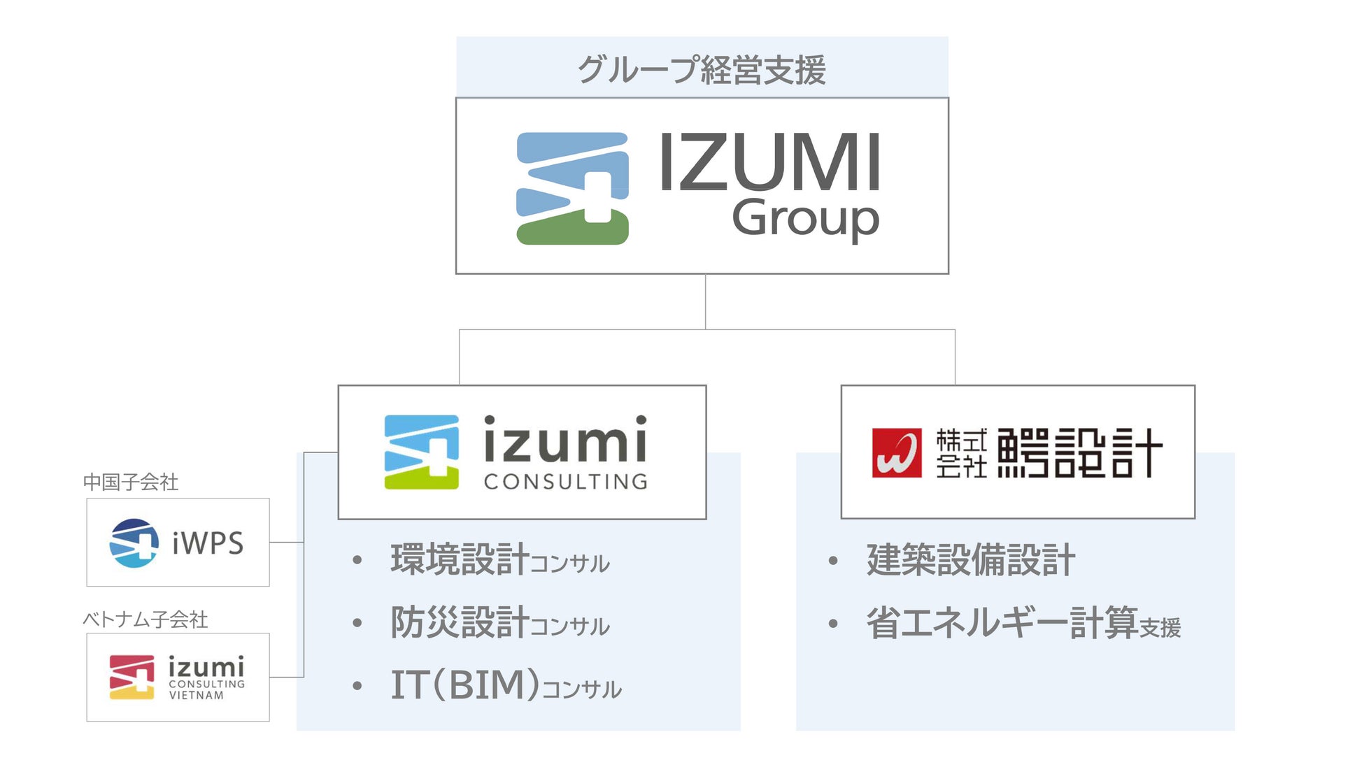関連会社:株式会社イズミコンサルティング、株式会社鰐設計、泉伙伴(瀋陽)信息技術有限公司(iWPS)、IZUMI CONSULTING VIETNAM CO., LTD.