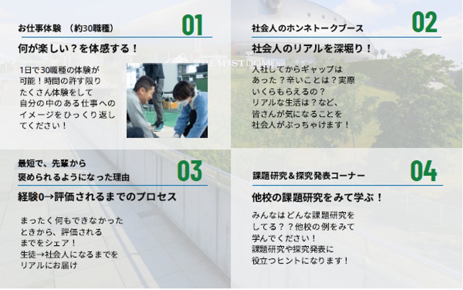 高校1〜3年生(定時制4年生)・保護者・教員を対象に、約30職種の仕事体験や社会人との本音トークを通じて、若者が持つ仕事や社会へのネガティブな先入観を「体験と出会い」でひっくり返すことを目的としたイベントです。