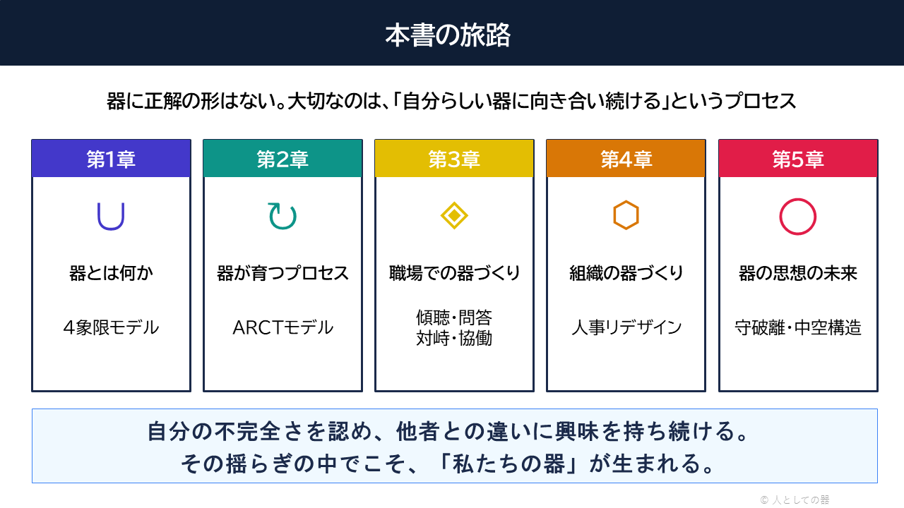本書で述べる「器」とは、「感情・態度・自我・認知」という4象限の要素で構造的に定義されます。また器が育つプロセスを「ARCTモデル(蓄積→認識→構想→変容)」として体系化し、器づくりに向けた実践方法を「傾聴・問答・対峙・協働」という4つの具体的なアプローチに落とし込んでいます。表面的な手法の提示に終始せず、自らの「あり方」と根本から向き合うための深い問いと知見を提供する、長く読み継がれる普遍的な価値を持った一冊です。