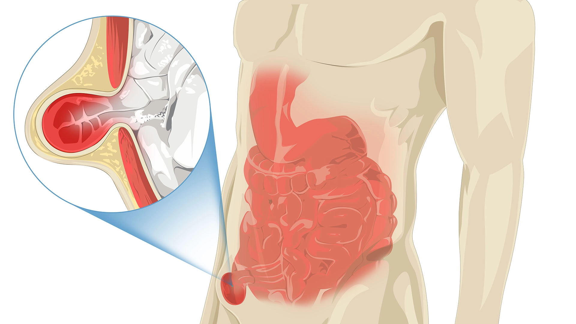 発症初期には、鼠径部に小さな膨らみがみられる程度で、痛みなどの自覚症状が乏しいことも多く、放置されてしまうケースも少なくありません。しかし、鼠径ヘルニアを放置すると、嵌頓(かんとん)と呼ばれる重篤な合併症を引き起こす可能性があります。