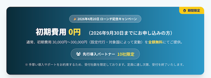 正式リリースを記念し、2026年9月30日までにお申し込みいただいた企業様を対象に、初期費用(通常30,000円〜300,000円)を全額無料とする期間限定キャンペーンを実施します。導入サポートを確実にご提供するため、先着10社限定の「先行導入パートナー」としてお迎えいたします。