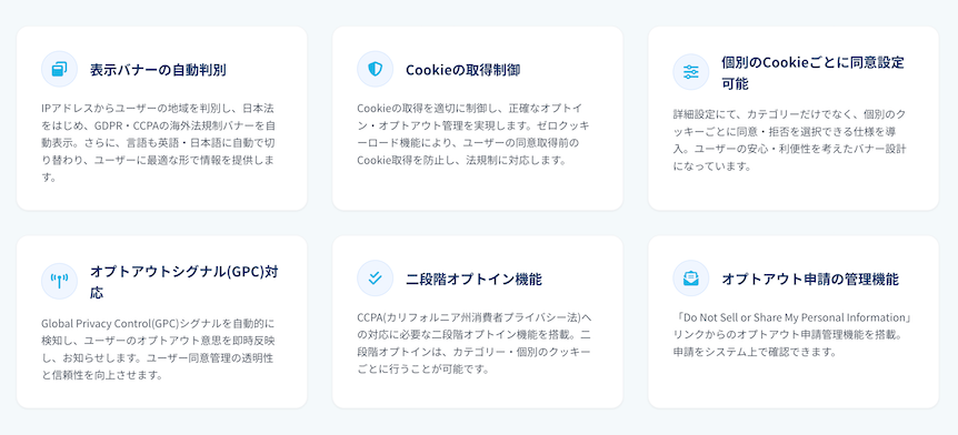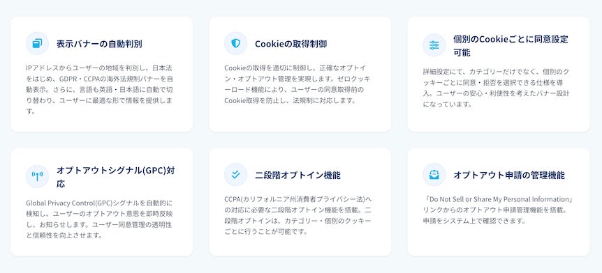 IPアドレスからユーザーの地域を判別し、日本・EU(GDPR)・米国(CCPA)それぞれに最適化された同意バナーを、日本語・英語で自動表示します。越境サイトやグローバル展開企業でも国・言語ごとに運用を分ける必要がありません。