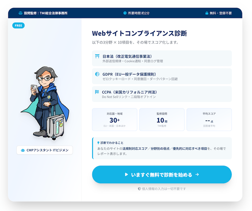 正式リリースにあわせ、『ITLINE CMP』特設サイトにて、登録不要・無料で利用できる「Webサイトコンプライアンス診断」を公開しました。改正電気通信事業法(日本)、GDPR(EU)、CCPA(米国)の3つの分野・計10問から、自社サイトの対応状況をその場でスコア化します。個人情報の入力は一切不要で、診断後すぐに、優先的に確認すべき項目や分野別の傾向をまとめた結果レポートを表示。複雑化する規制対応の第一歩をサポートします。