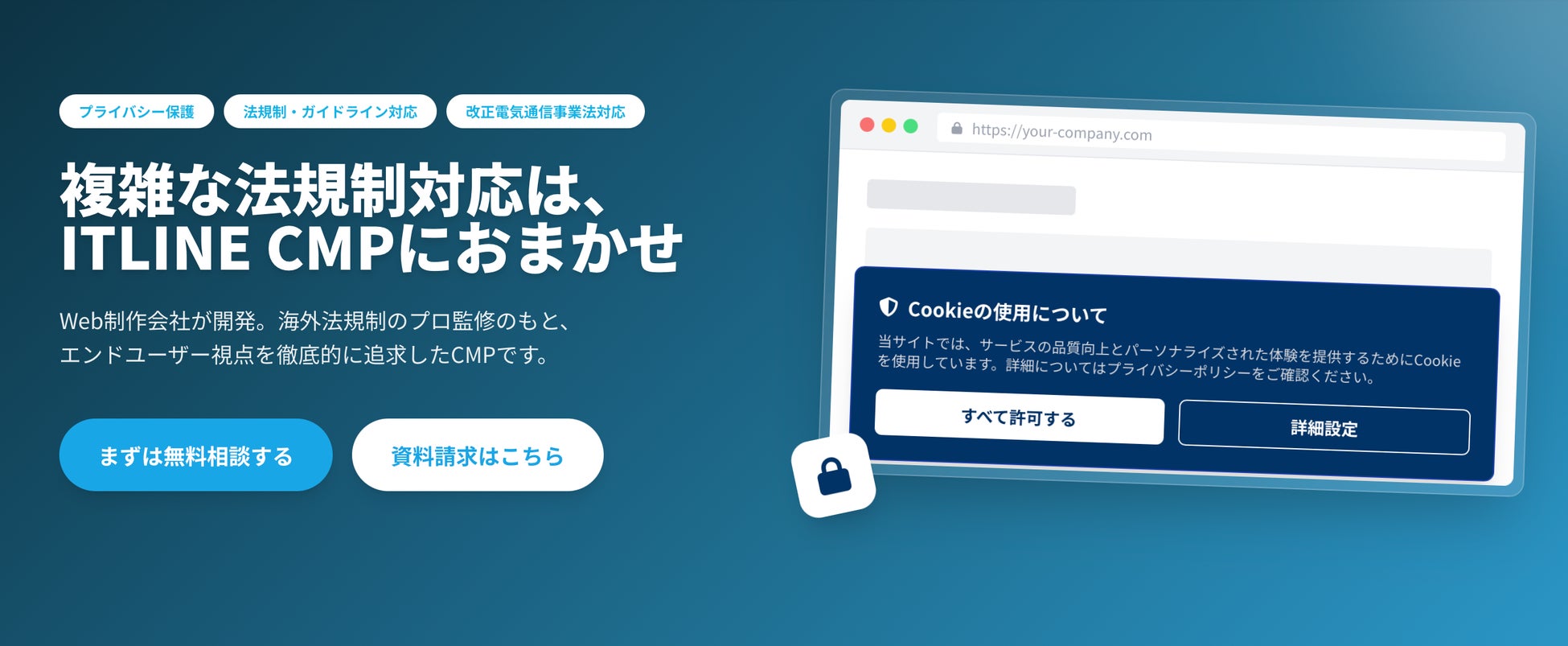 株式会社ITLINE(本社:東京都港区虎ノ門、代表取締役:小玉 知伸、以下「当社」)は、生成AIの普及とデータ利活用の拡大にともない、その重要性が急速に高まる個人情報および個人関連情報の適切な取り扱いを支援するため、Cookie同意管理プラットフォーム『ITLINE CMP』を2026年4月20日(月)より提供開始いたします。改正電気通信事業法、GDPR(EU一般データ保護規則)、CCPA(米国カリフォルニア州消費者プライバシー法)など、複雑化する国内外のプライバシー規制に対し、サイト改修不要・最短5分で導入可能な設計としました。正式リリースを記念し、先着10社限定で初期費用(通常30,000円〜300,000円)を無料とする「先行導入パートナー」キャンペーンを2026年9月30日まで実施いたします。