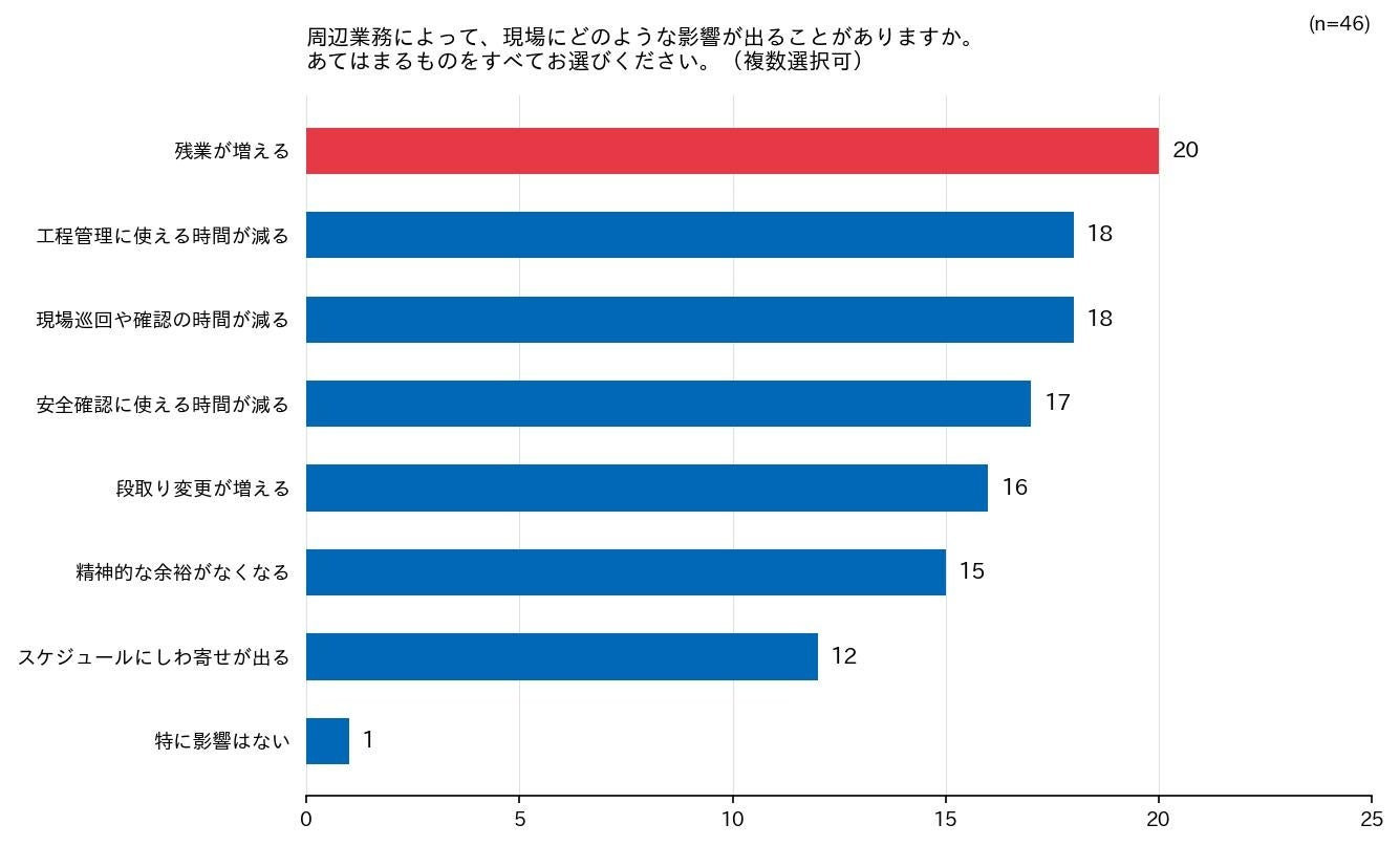 周辺業務による現場への影響(複数選択)では、「残業が増える」が20件で最多。「工程管理に使える時間が減る」と「現場巡回や確認の時間が減る」がそれぞれ18件、「安全確認に使える時間が減る」が17件と続きました。
