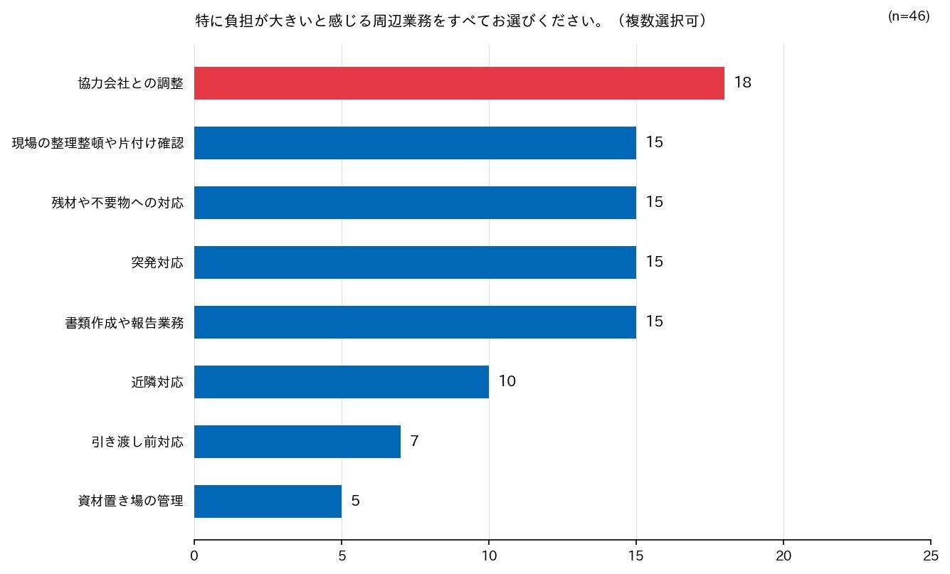 ■負担が大きい周辺業務は「協力会社との調整」が最多18件――整理整頓・残材・突発対応も並立