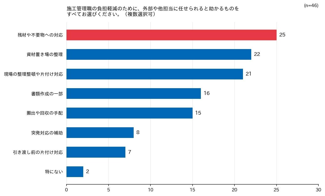 施工管理職の負担軽減のために外部や他担当に任せられると助かるもの(複数選択)では、「残材や不要物への対応」が25件で最多。