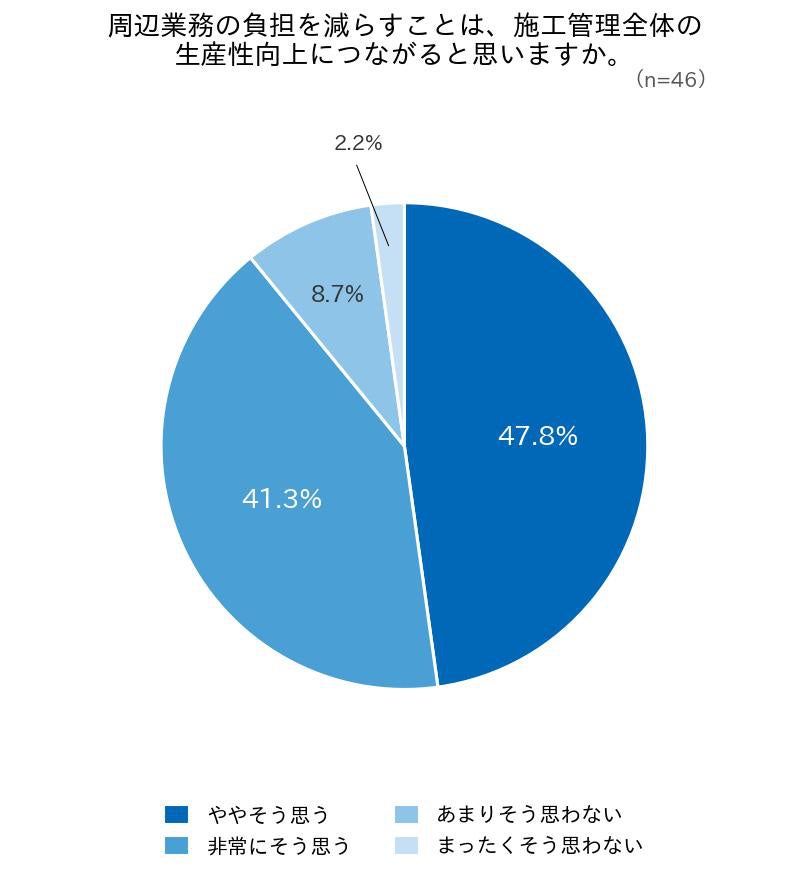 「周辺業務の負担を減らすことが施工管理全体の生産性向上につながると思うか」については、「非常にそう思う」が41.3%、「ややそう思う」が47.8%で、合計89.1%が肯定的な回答をしました。