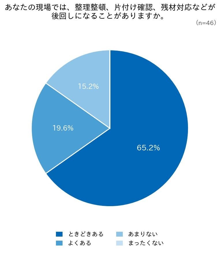 「整理整頓、片付け確認、残材対応などが後回しになることがあるか」については、「よくある」が19.6%、「ときどきある」が65.2%で、合計84.8%がこうした対応を先送りにした経験を持つことが明らかになりました。
