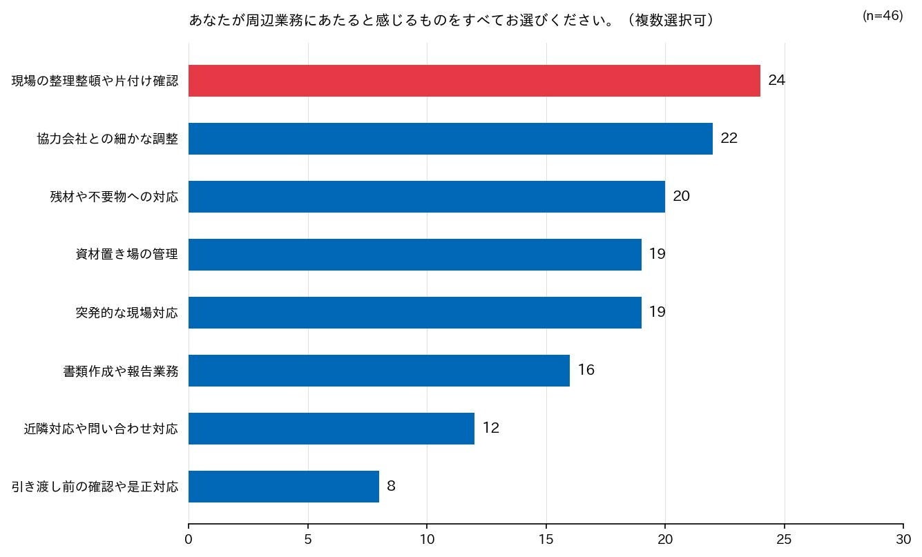 次いで「協力会社との細かな調整」が22件、「残材や不要物への対応」が20件、「資材置き場の管理」と「突発的な現場対応」が各19件と続き、現場の物的管理から人的調整まで幅広い業務が周辺業務として認識されていることがわかりました。
