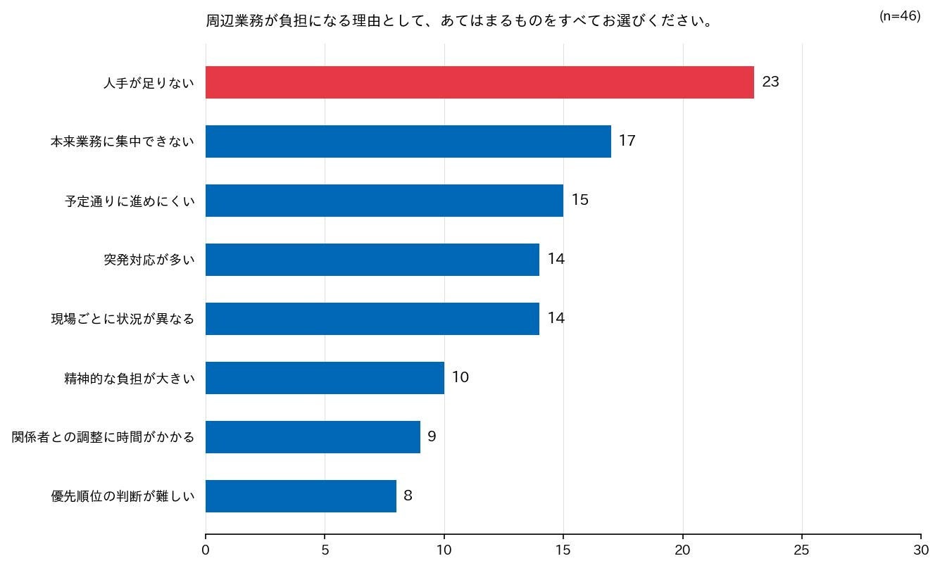 周辺業務が負担になる理由(複数選択)として、「人手が足りない」が23件で最多。