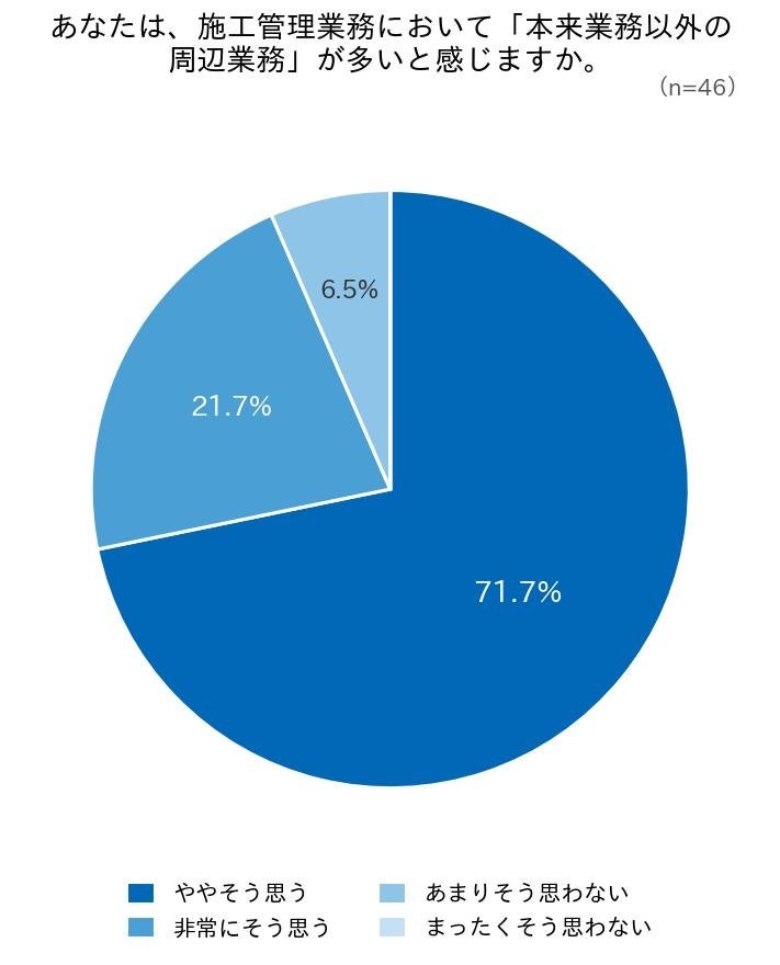 今回の調査では、大多数の施工管理職が周辺業務の多さを実感しており、本来業務への圧迫も広く経験されていることが明らかになりました。