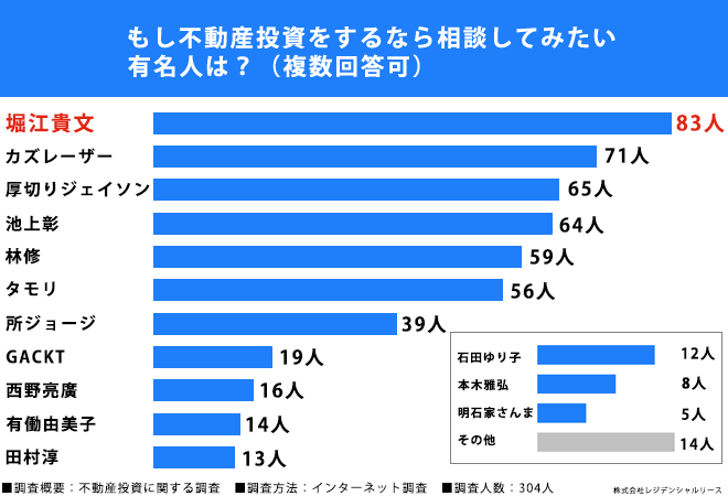 40歳以上の会社員304名に調査!「もし不動産投資をするなら相談してみたい有名人ランキング」第1位は堀江貴文さん