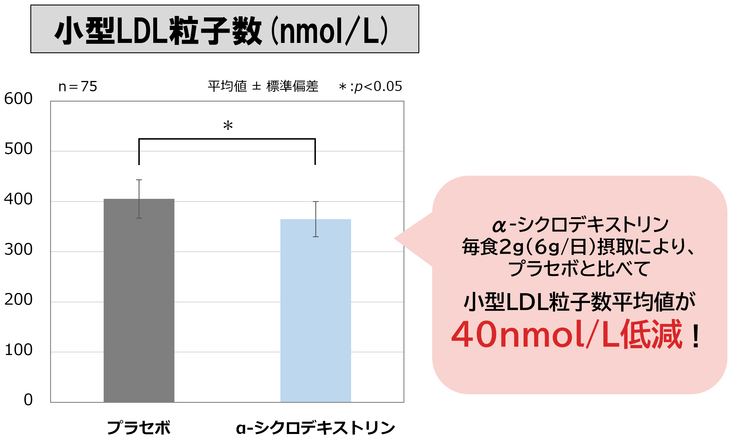 健常な男女(18~75歳)に対し、α-シクロデキストリン6g/日(2g/食)を12~14週間経口摂取させた結果、摂取後にはプラセボ群と比べて小型LDL粒子数が有意に低値を示した(α-シクロデキストリン群:365±35nmol/L、プラセボ群:405±38nmol/L、α-シクロデキストリン群とプラセボ群の平均差:-40nmol/L、p<0.05)。