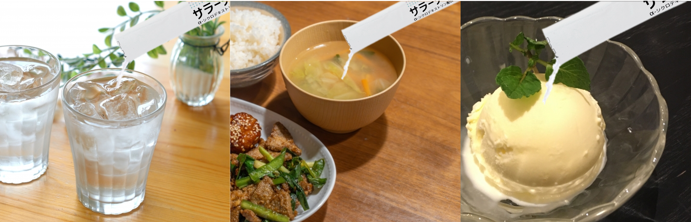 サラーチαは冷たい飲料に入れてかき混ぜてもさっと溶けるうえ、熱にも強く温かい汁物などにも混ぜていただけます。ほぼ無味の顆粒であるため、料理の味を邪魔しづらく、デザートなどにふりかけても美味しくお召し上がりいただけます。