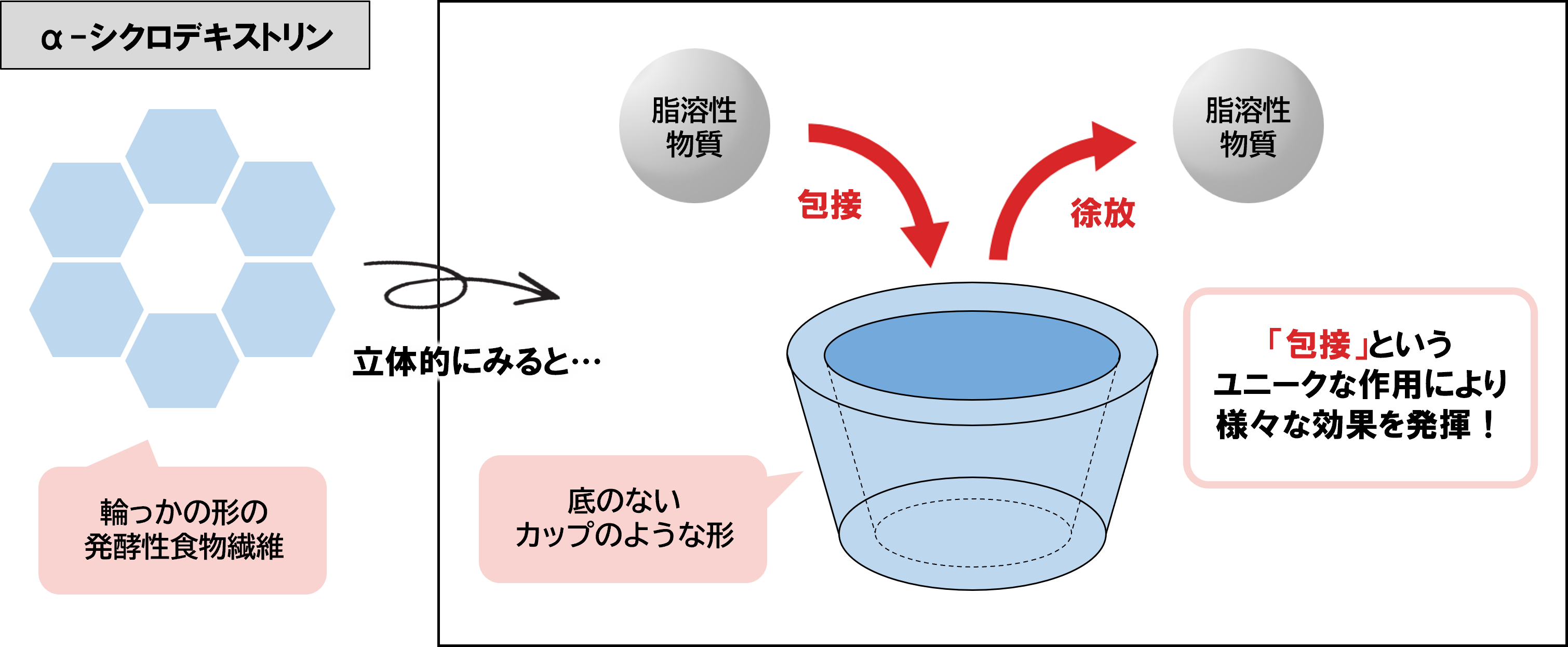α-シクロデキストリンとは、トウモロコシ由来の発酵性食物繊維です。α-シクロデキストリンは6つのブドウ糖が輪っか状に連なった形をしており、さらに立体的に見ると底のないカップのような面白い形状をしています。α-シクロデキストリンは、このカップの中に油に溶ける物質を取り込む「包接」というユニークな作用を持つことで、様々な効果を発揮します。