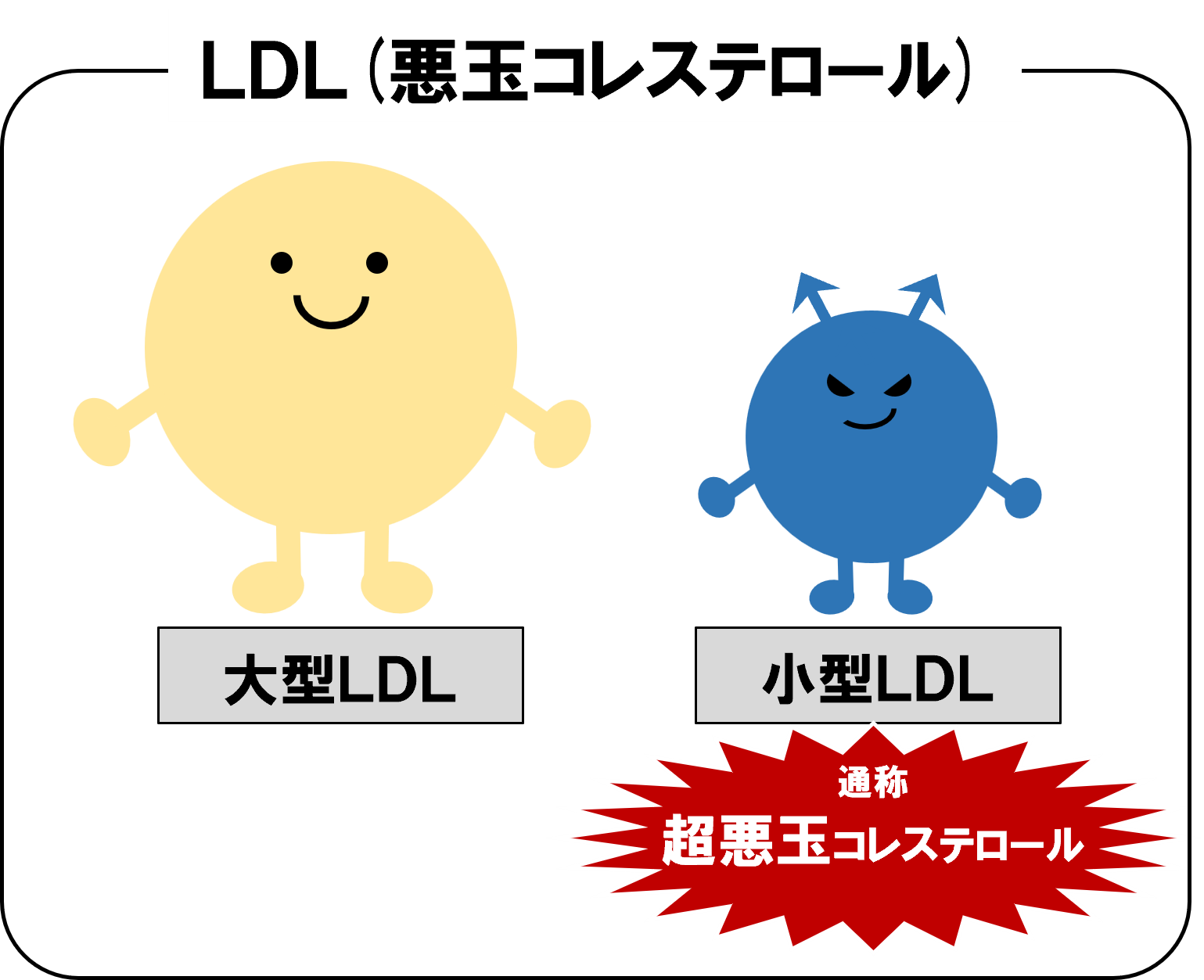 小型LDL(small dense LDL)とは、いわゆる悪玉コレステロールと呼ばれるLDLの中でも、サイズの小さいものを指します。小型LDLは大型LDLよりも①血管内に長く滞在する、②血管壁の内側に入り込みやすい、③酸化されやすいなどの特徴を持ち、通称『超悪玉コレステロール』と呼ばれています。そのためLDL(悪玉コレステロール)値が正常な範囲内であっても、小型LDLの割合が高い場合は、健康維持の観点からより細かな脂質マネジメントを意識することが推奨されています。