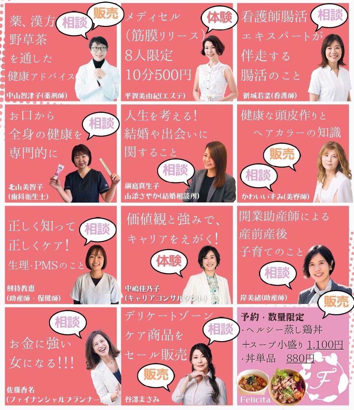 リアル会場にて、薬・漢方・野草茶を通した健康アドバイス、筋膜リリース体験、腸活相談、お口から全身の健康相談、生理・PMS相談、産前産後や子育て相談、キャリア相談、人生相談、ファイナンシャル相談、デリケートゾーンケア商品の紹介などの多様な体験・相談ができる11ブースとヘルシーな食事とカフェメニューを用意しています。