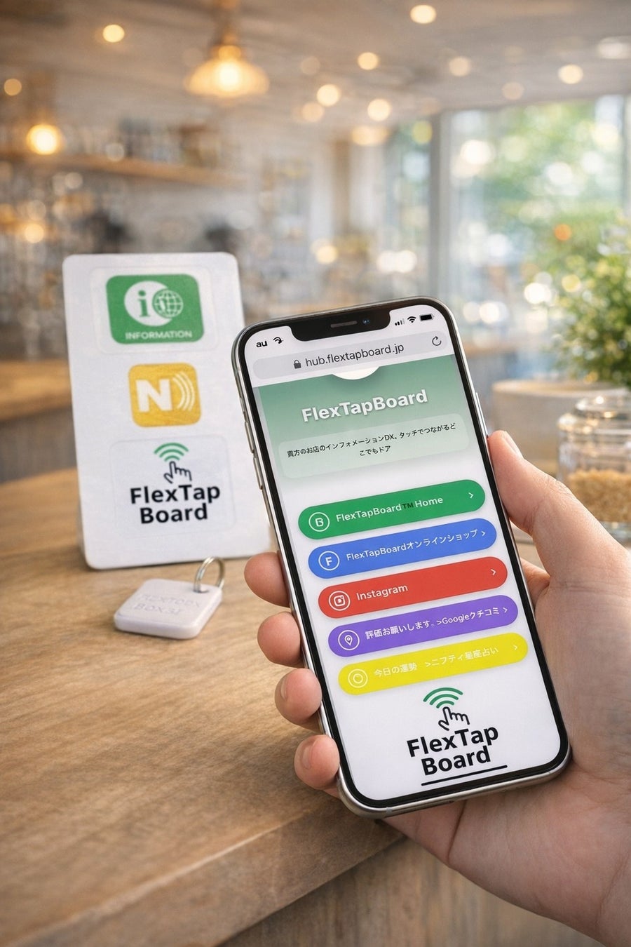 FlexTapBoardは、スマートフォンをかざすだけで、施設案内、多言語ページ、予約ページ、SNS、公式サイト、Googleマップなど、必要な情報へスムーズにアクセスできるNFC案内サービスです。
