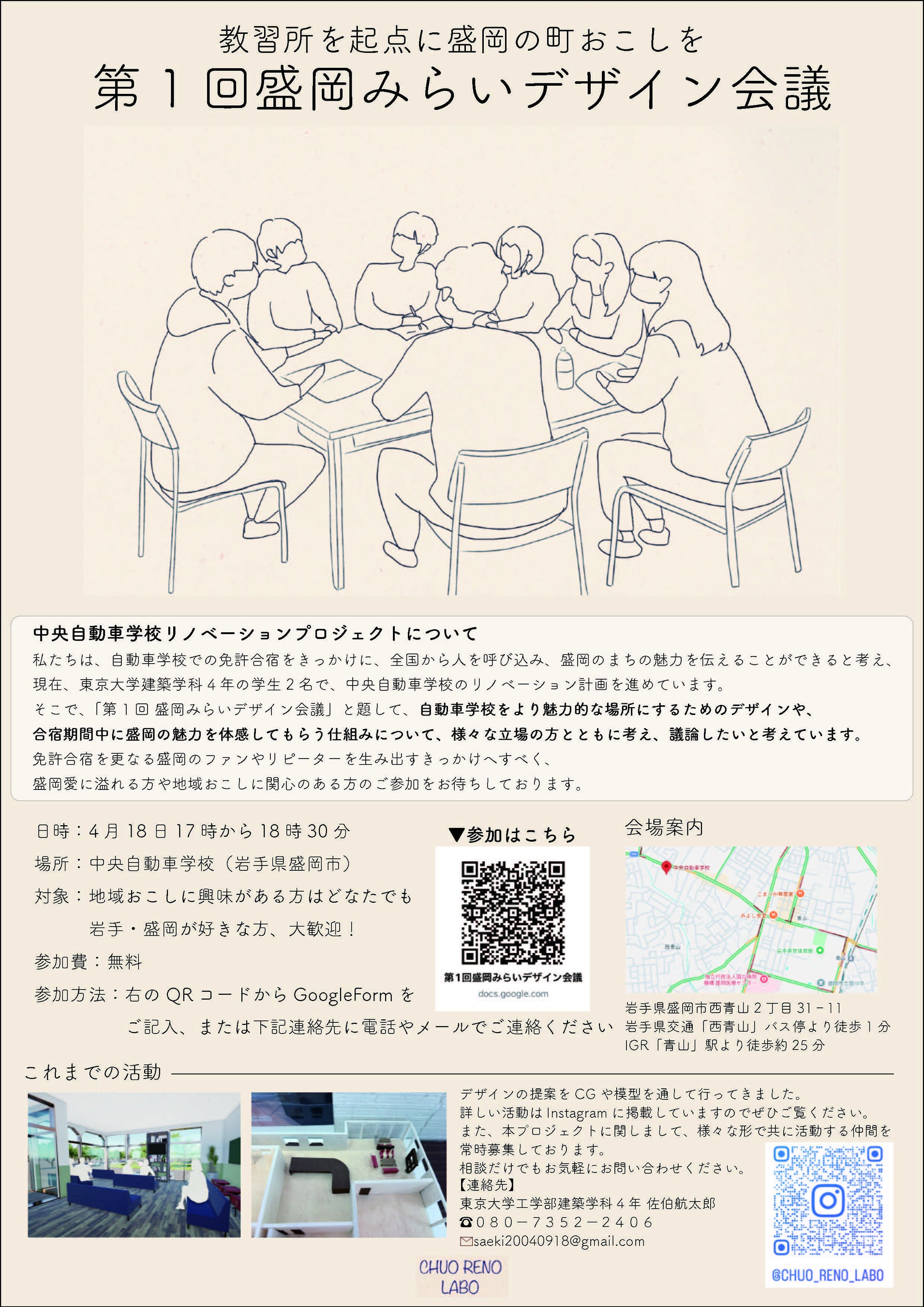 続く17時からは、「第1回 盛岡みらいデザイン会議」と題し、当校関係者のみならず地域の皆様を広くお招きしたオープンなワークショップを開催いたします。ここでは、プロフェッショナルな視点を持つ両氏のファシリテーションのもと、リノベーションデザインや新たな免許合宿プランについて、地域住民の皆様と共に議論・検討を行う予定です。