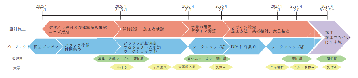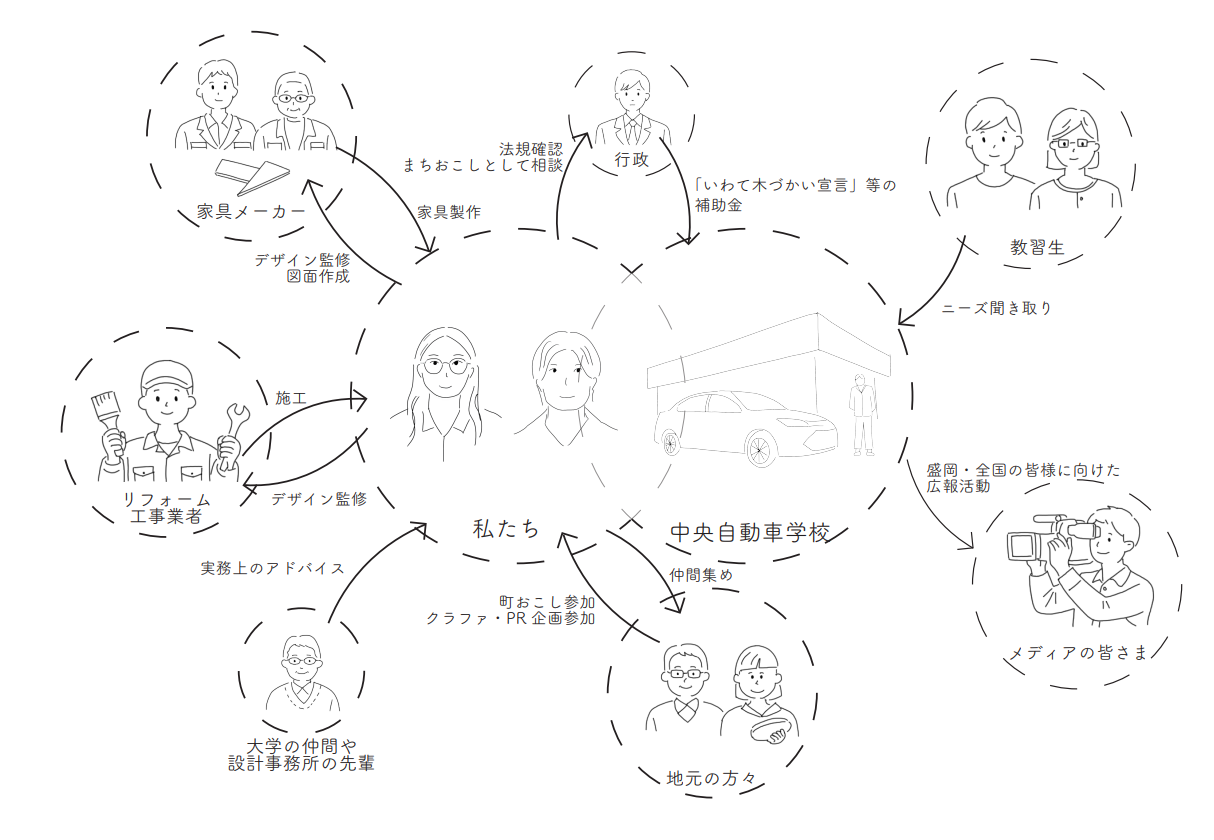 当校では、2025年11月に本プロジェクトのデザイン概要および施工計画の提案を受領し、プロジェクトの全体像を策定いたしました。本プロジェクトでは、地域住民の皆様と共にDIYやワークショップを実施することを検討しており、地域社会と協同することで新たな価値を創出してまいります。すでに、盛岡で活動するボランティア団体や地元の施工業者、地域の魅力の発信者の皆様と協議を重ねており、今後のワークショップ運営や広報活動において多大なるご協力をいただく体制を構築しております。