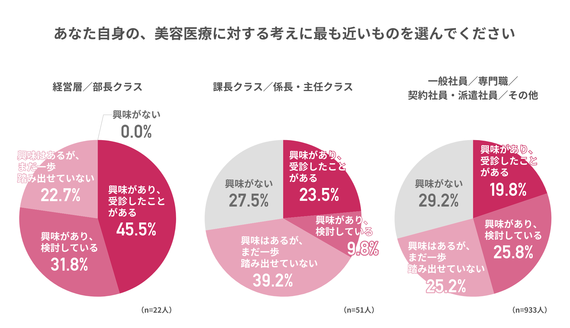 興味があると回答した方は「経営者・部長クラス」が10割、「課長クラス/係長・主任クラス」や「一般社員」などの層が約7割という結果になり、役職が上がるにつれて、美容医療を含むセルフケアへの関心が高まる傾向が見られました。