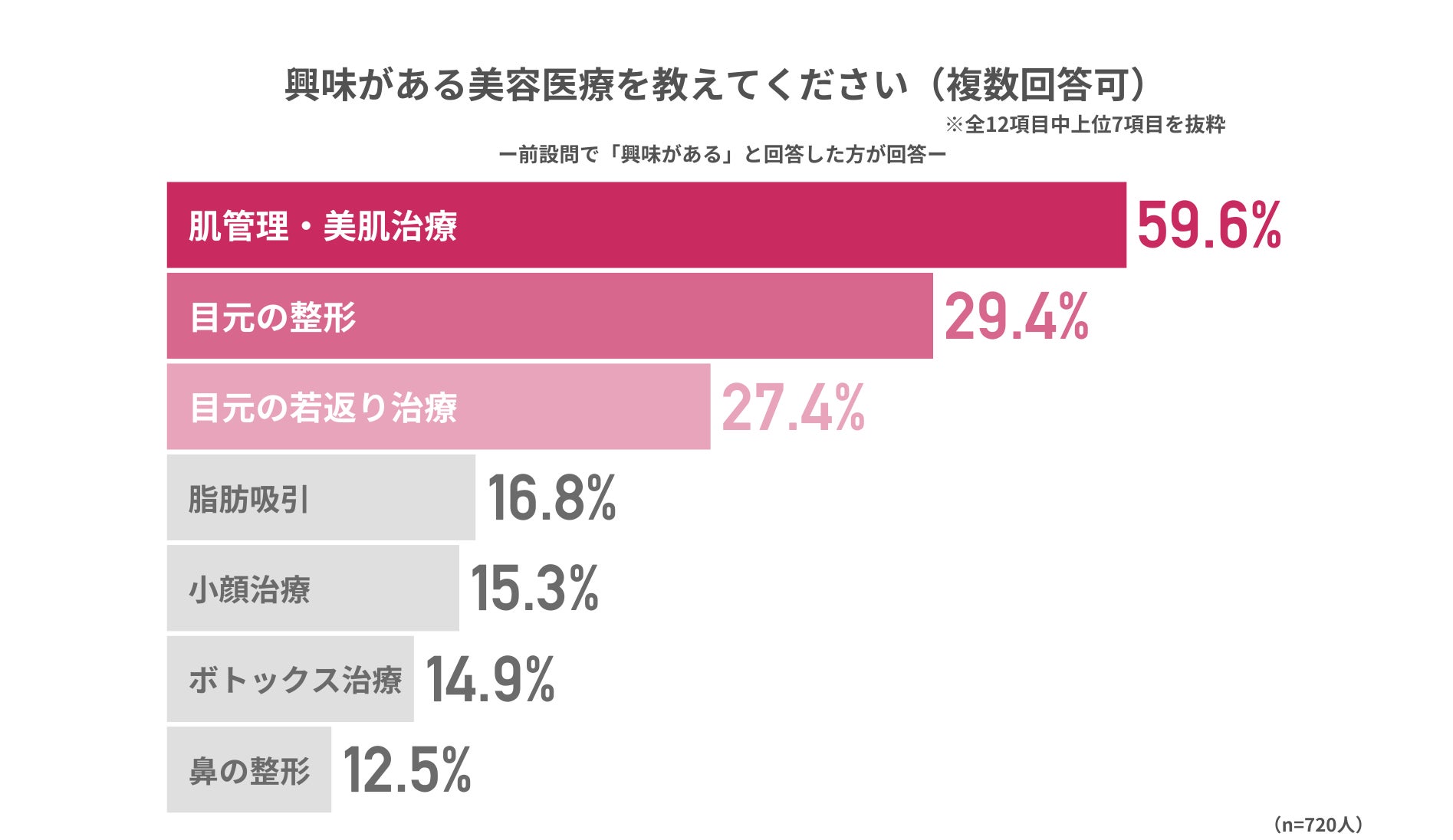 美容医療に興味があると回答した方に、「興味がある美容医療」について尋ねたところ、『肌管理・美肌治療(シミ・毛穴・ニキビ治療/ピーリング/美容注射など)(59.6%)』と回答した方が最も多く、『目元の整形(二重整形/目頭・目尻切開/たれ目形成など)(29.4%)』『目元の若返り治療(クマ・たるみ治療/まぶたのたるみ改善など)(27.4%)』と続き、肌や目元など、第一印象や清潔感に直結する部位への関心が多く挙げられる結果となりました。