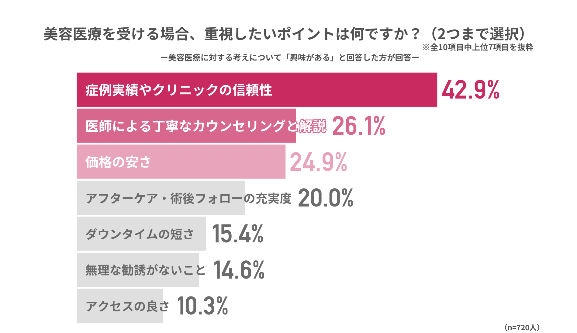 続いて、「美容医療を受ける場合、重視したいポイント」について尋ねたところ、『症例実績やクリニックの信頼性(42.9%)』と回答した方が最も多く、『医師による丁寧なカウンセリングと解説(26.1%)』『価格の安さ(24.9%)』と続きました。