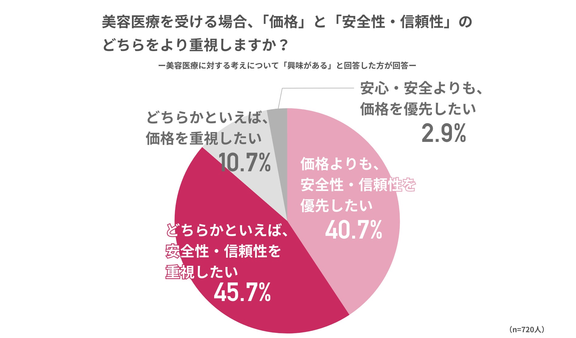 最後に、「美容医療を受ける場合、『価格』と『安全性・信頼性』のどちらをより重視するか」について尋ねたところ、『どちらかといえば、安全性・信頼性を重視したい(45.7%)』と回答した方が最も多く、『価格よりも、安全性・信頼性を優先したい(40.7%)』『どちらかといえば、価格を重視したい(10.7%)』と、安全性・信頼性を重視したい方は合計で約9割にのぼることが明らかになりました。