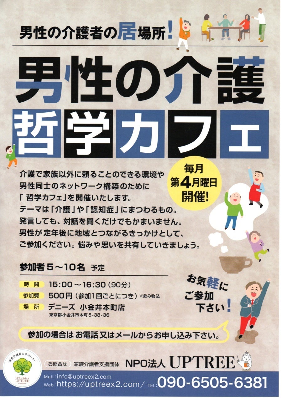 家族介護者支援(ケアラーサポート)を実施しているNPO法人UPTREE(所在地:東京都小金井市、代表理事:阿久津美栄子)は、介護者の男性同士が安心して語り合える場として「男性の為の介護哲学カフェ」を2026年4月27日に開催します。