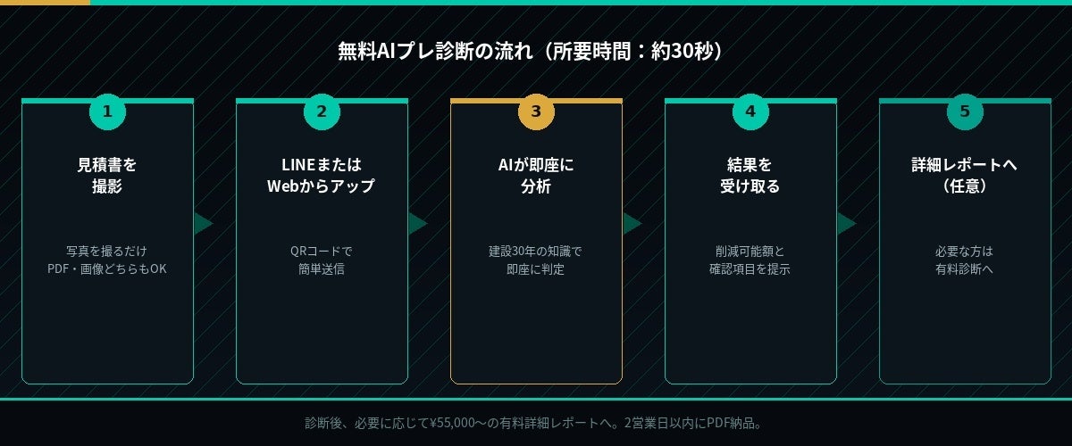 AI診断後、さらに詳しく知りたい方向けに専門家がPDFレポートを作成。相場より高い項目・交渉目標値・業者への交渉文言サンプルをセットで提供します。2営業日以内にメール納品。