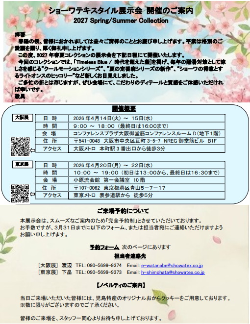 陽春の候、皆様におかれましては益々ご清祥のこととお喜び申し上げます。この度、2027年春夏コレクション展示会を大阪と東京で開催いたします。今回は「Timess Blue(時代を超えた藍)」をテーマに掲げあらためて日本のモノづくりの良さを実感していただきたいと存じます。ぜひ会場にて弊社生地を手に取ってお確かめください。