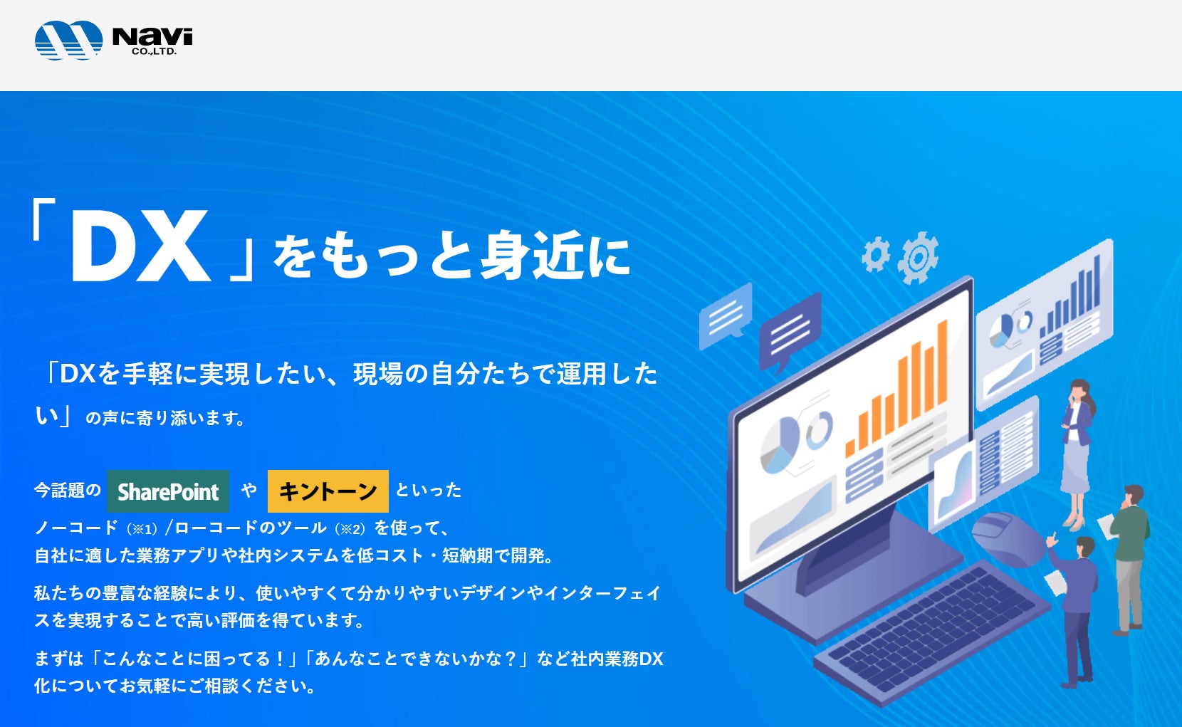 株式会社ナビは「DXをもっと身近に」をコンセプトに、中小企業を中心とした業務改善・業務効率化を支援しています。