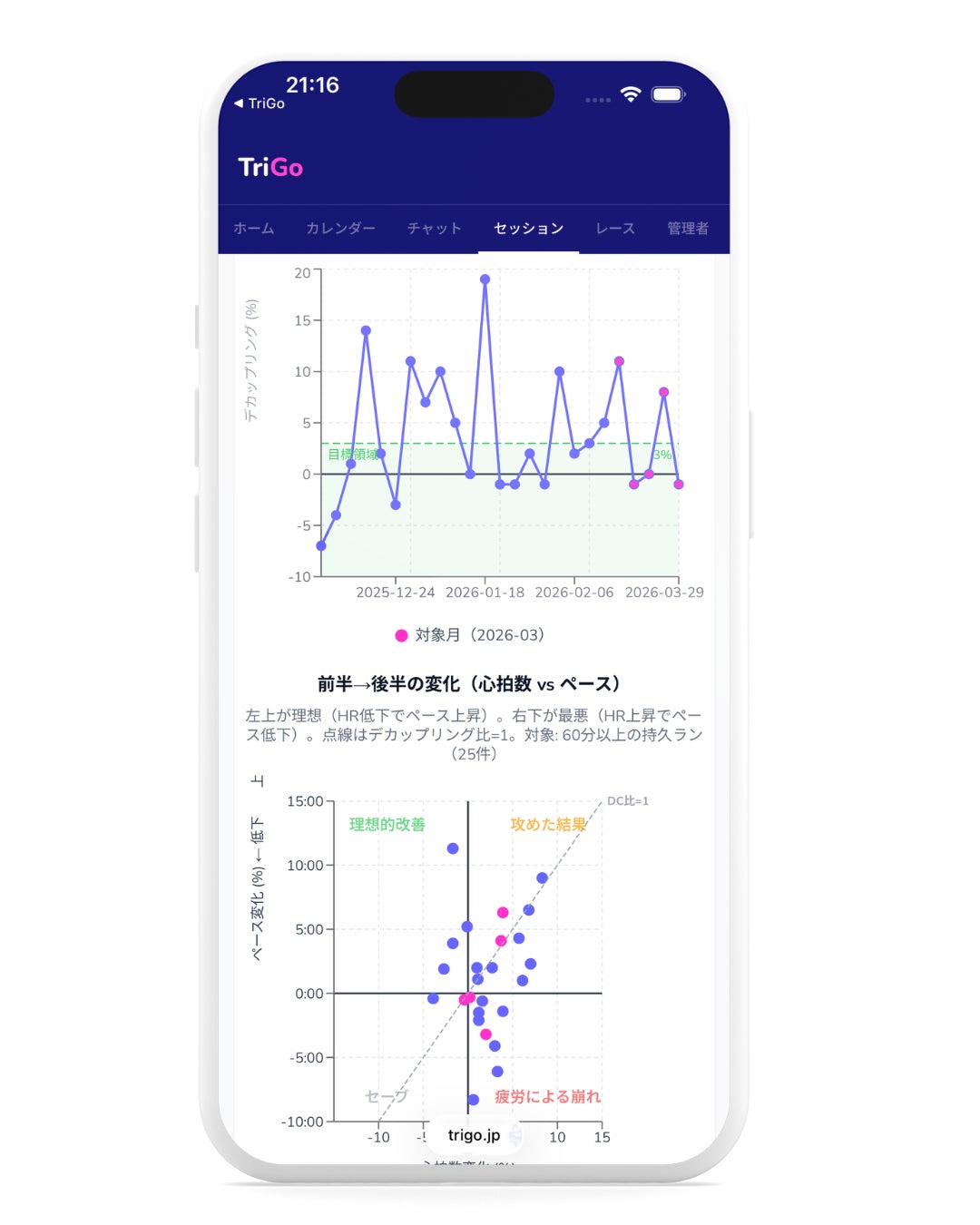 TriGoの最大の特徴は、運動生理学の指標をアルゴリズムの中核に据えている点です。一般的なテンプレート型のトレーニングアプリとは異なり、ユーザーのVO2max、乳酸性閾値、ランニングエコノミーなどの生理学的データをもとに、個々の身体能力とレース目標に最適化されたトレーニング計画を自動生成します。