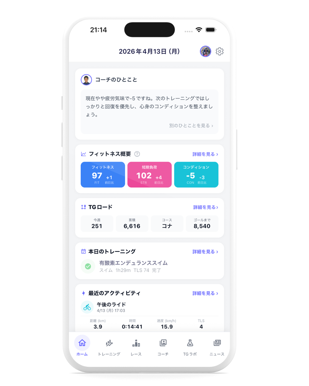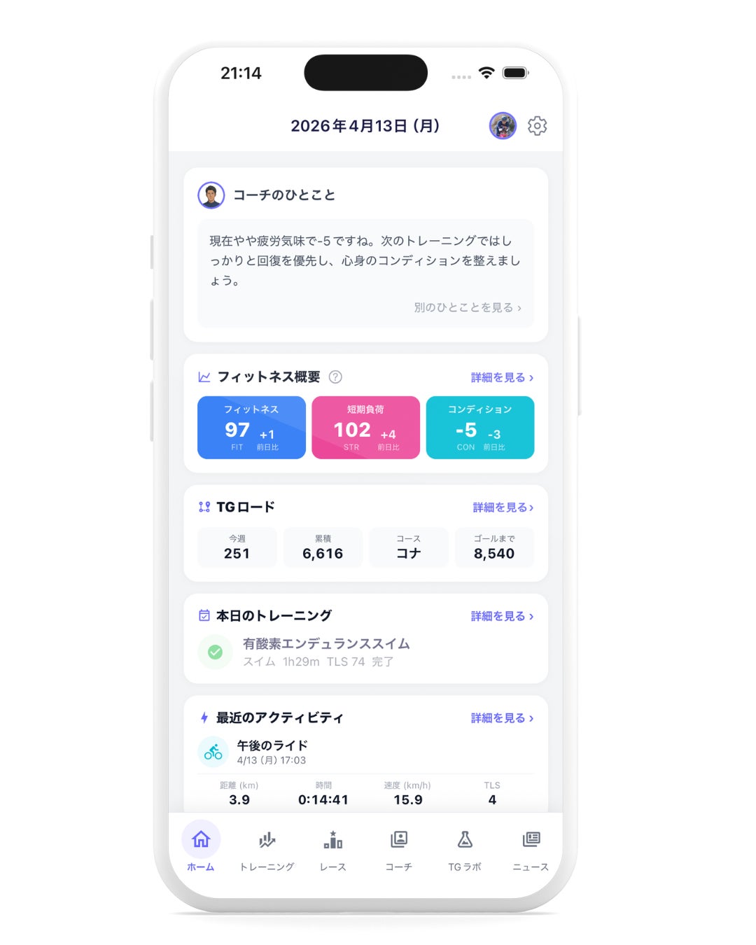 日々のワークアウトやTGラボでの学習、SNSでの拡散に応じてポイントが貯まり、架空のトライアスロンコースを進んでゴールを目指す独自のゲーミフィケーション機能「TGロード」を搭載。楽しみながらトレーニングを継続できる仕組みを提供します。